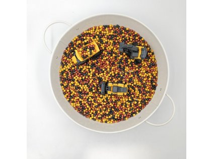 Barevná cizrna je základní pomůckou při smyslohraní. Je příjemné se prohrabávat smyslovým materiálem, hledat v něm věci, nabírat a přesypávat. Tvořit z něj různé světy zabaví nejedno dítě a dokonce i dospělé.