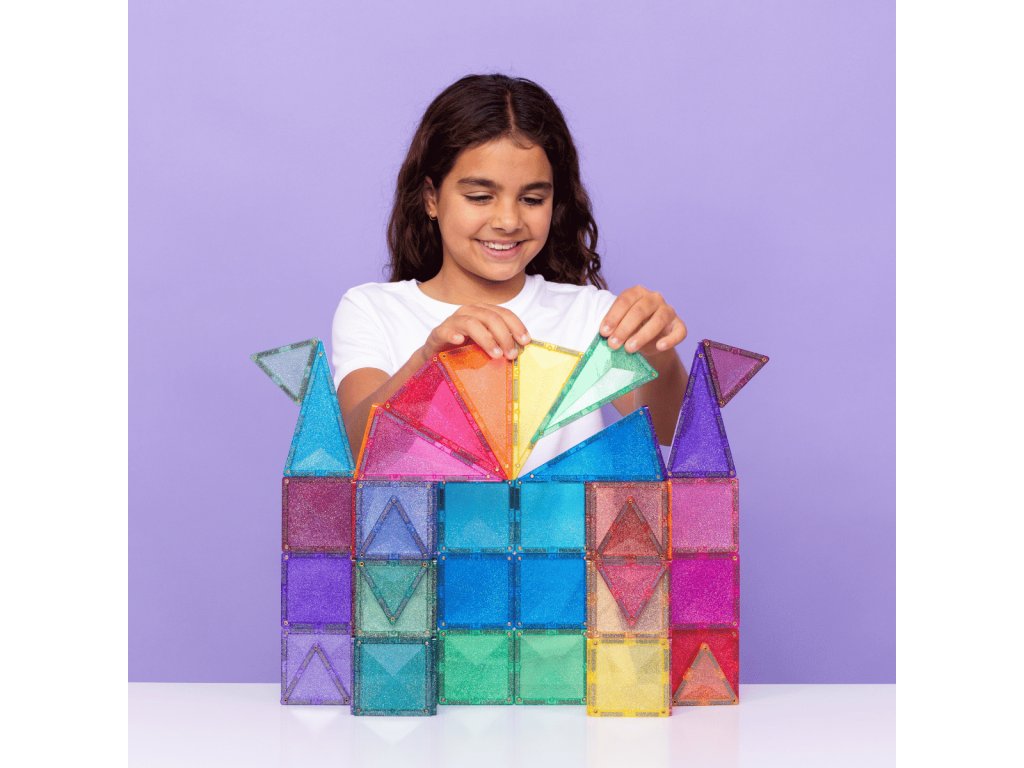 Tato sada obsahuje čtverce a kombinaci rovnoramenných a rovnostranných trojúhelníků, které všechny překypují vícebarevnými třpytkami, a je ideální pro stavění třpytivých hradů, věží, mostů, zvířat a mnoha dalších věcí!
