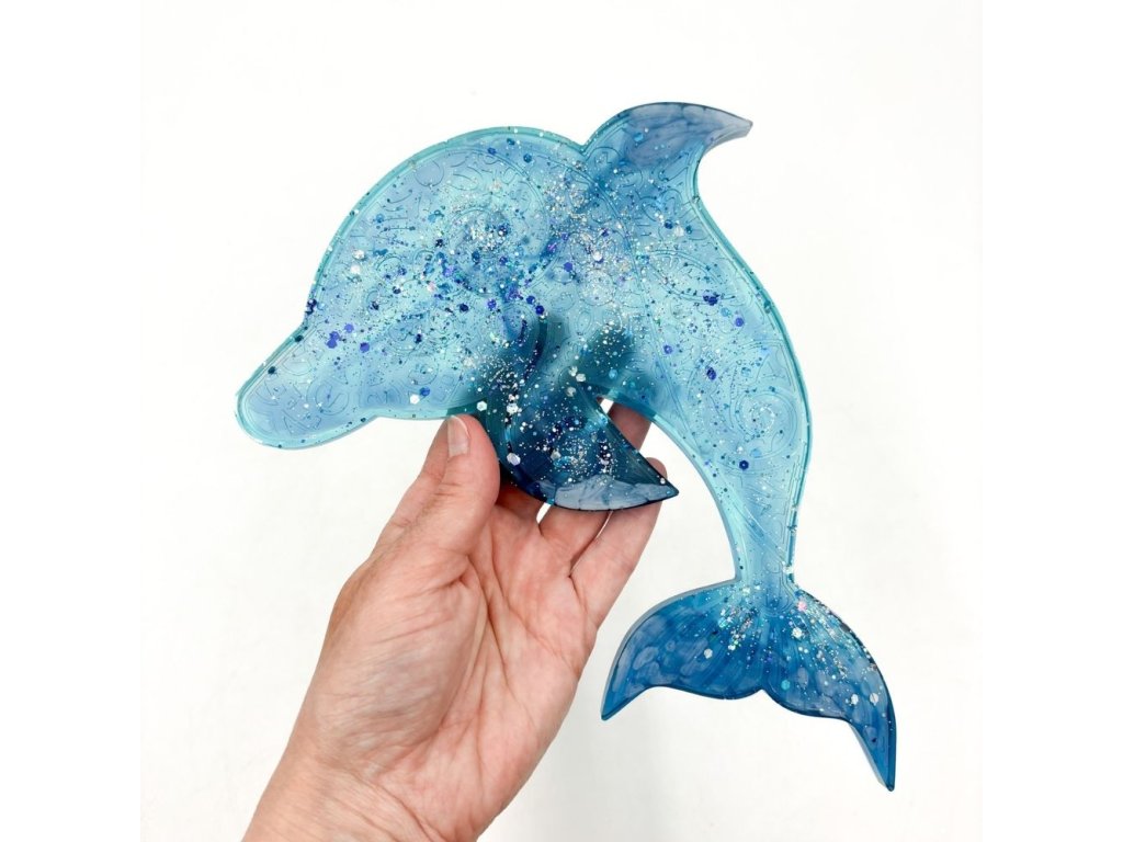 Krásný velký delfín z pryskyřice. Děláme je v různých barvách a s různými třpytkami. Pokud máte barevné přání, napište do poznámky. Pokud zrovna nebude skladem, počítejte s delším dodáním. Jinak volíme dle skladových zásob.
