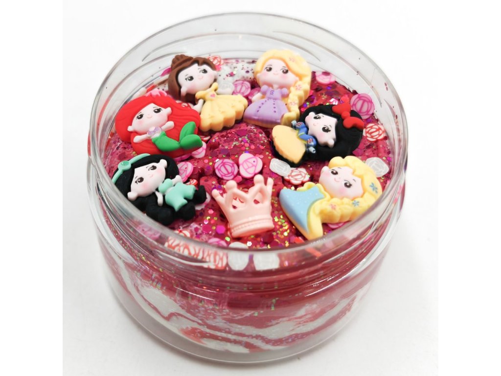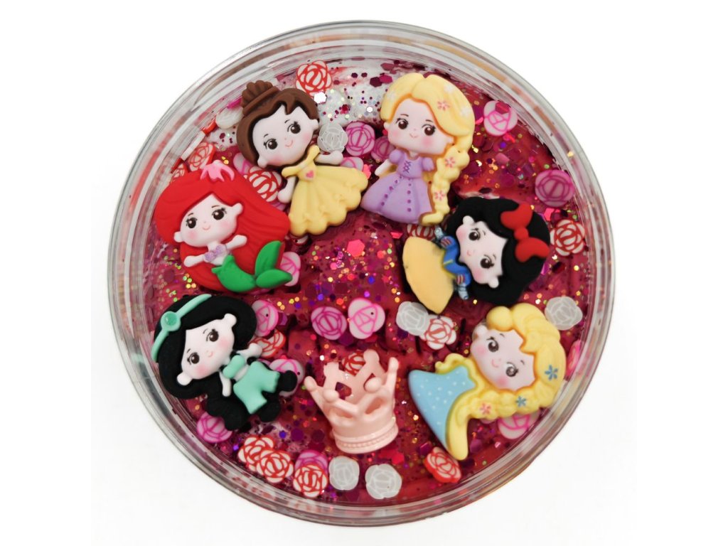 250g úžasné měkkoučké domácí modelíny mixované ze tří barev. Třpytí se díky dvěma druhům třpytek, konfety, 6ks dekorací princezen, korunka.