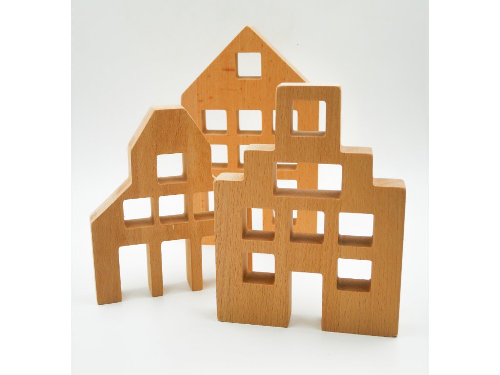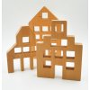 Sada obsahuje 3 ks dřevěných domečků. Pasují do nich kostičky o velikosti 2,5x2,5x2,5 cm