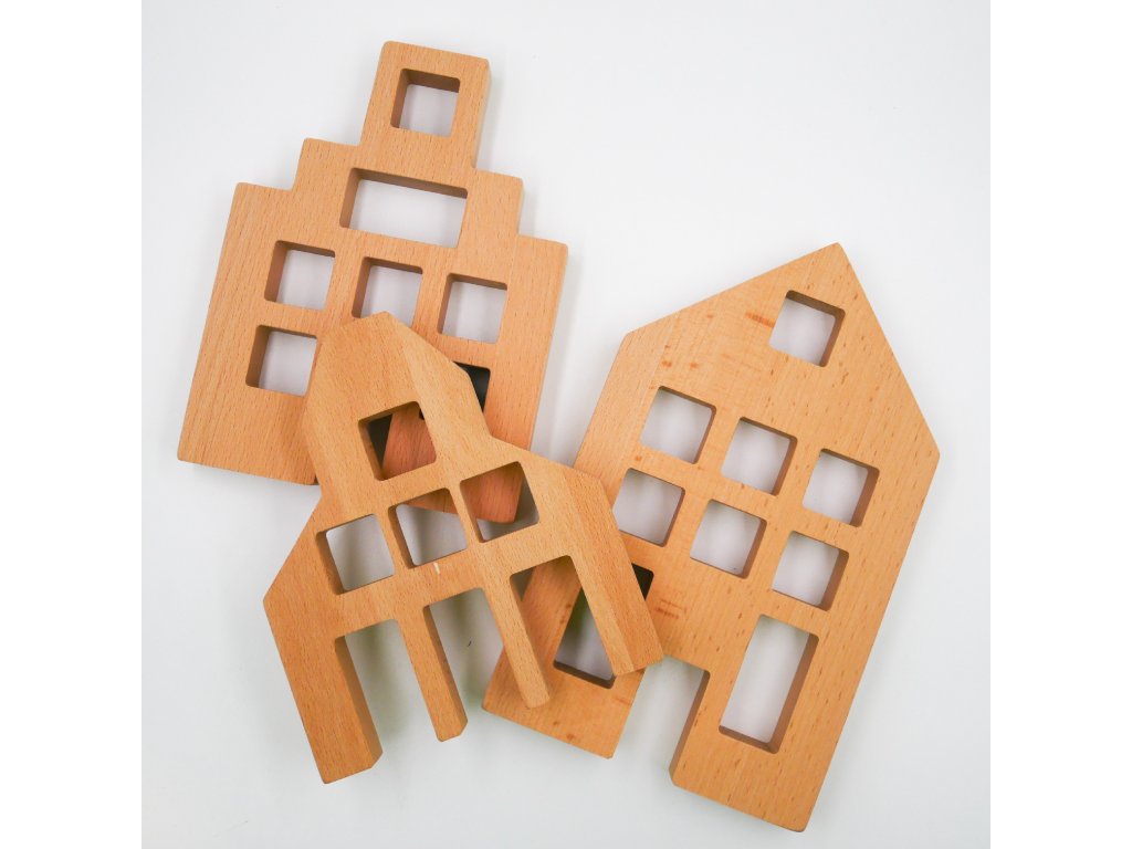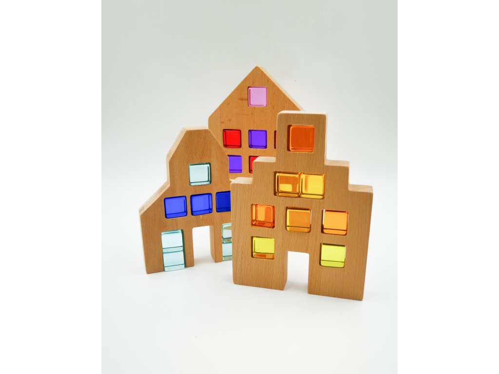 Sada obsahuje 3 ks dřevěných domečků. Pasují do nich kostičky o velikosti 2,5x2,5x2,5 cm