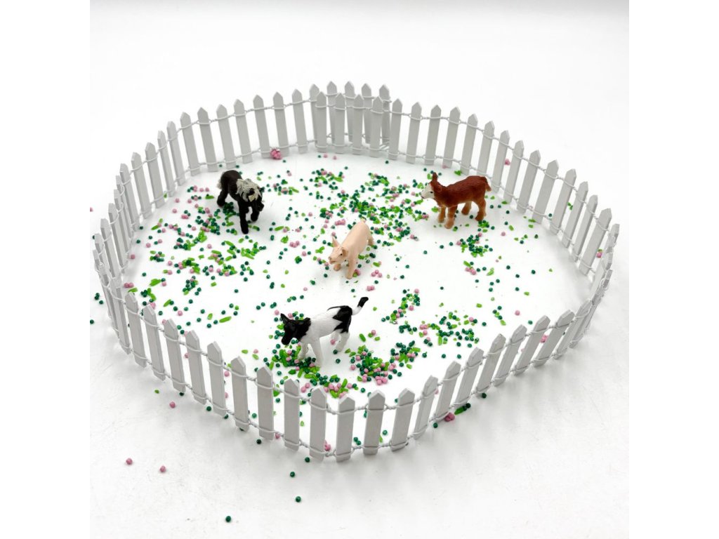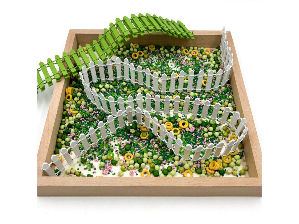 Krásné barevné ploty využijete jako doplněk na smyslohraní se sypkým barevným materiálem či s kinetickým pískem. Vytvořte si krásnou zahrádku, ohrádku pro zvířátka a nebo třeba bludiště!