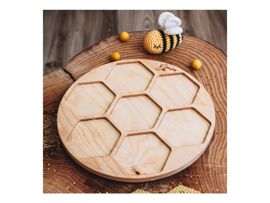 Dřevěný tác! Tak jednoduchá věc, ale tolik možností! Dřevěný podnos v podobě plástve zajistí především pořádek a estetiku po hře s malou sadou senzorických desek. A nejen to! Zásobník můžete využít i pro zábavu například jako základnu pro hraní s naléváním všemožných sypkých materiálů, pro učení psaní, pro počítání, pro třídění panelů podle hmatových vjemů atd.