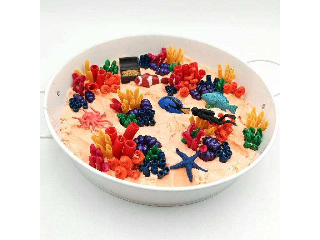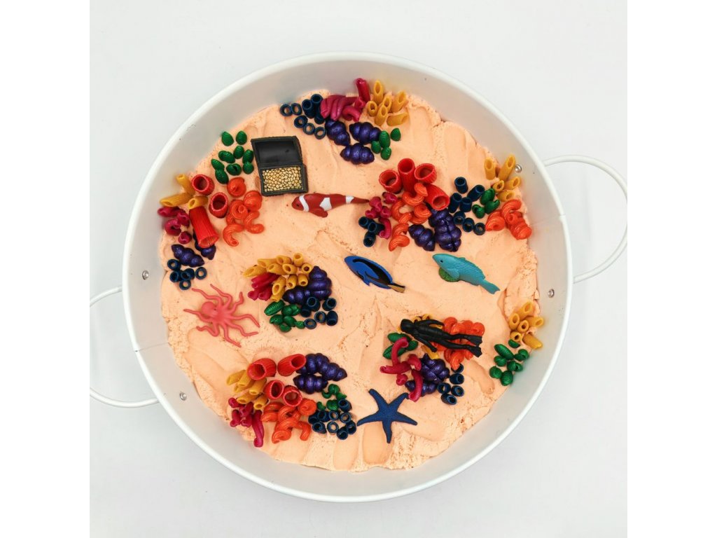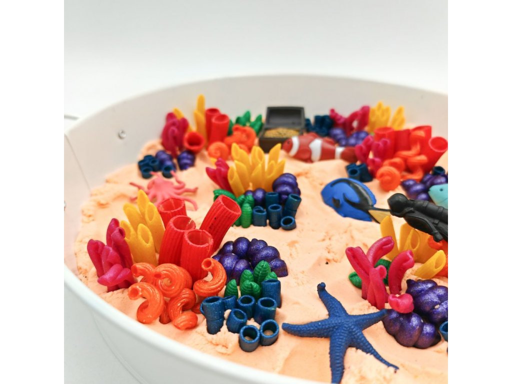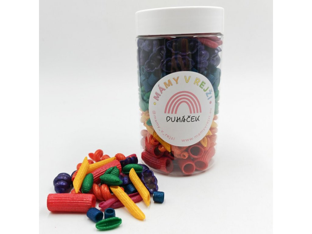 Cca 320g barevných metalických těstovin různých barev a tvarů, které jsme vytvořily speciálně pro mořské smyslohraní na tvoření korálů.