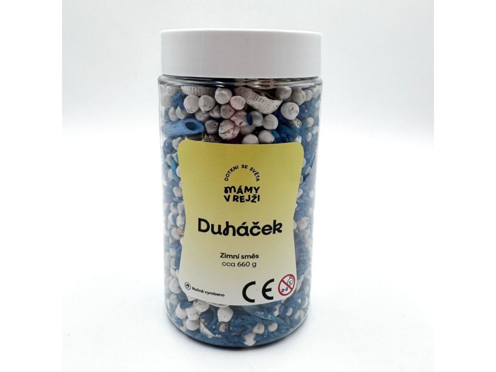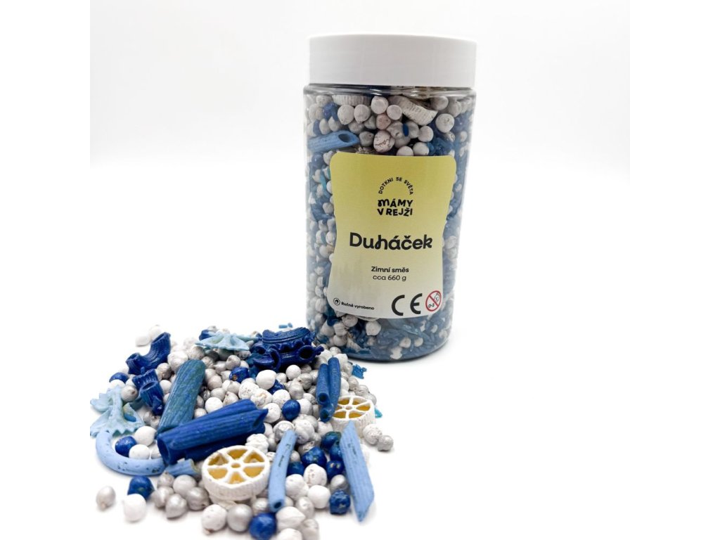 Cca 660g zimní směsi obsahuje: modrou rýži, metalickou stříbrnou cizrnu, bílou cizrnu, metalickou modrou cizrnu, modré těstoviny.