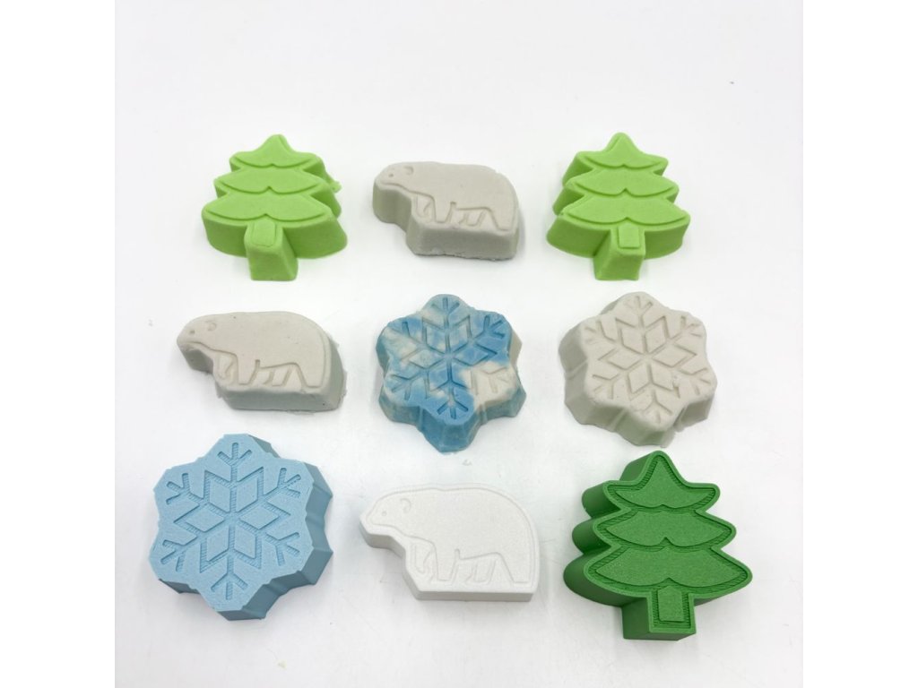 Bábovičky mají velikost cca 6×4x2,5 cm. Sada obsahuje stromeček, vločku a ledního medvídka, které použijete na tvarování s modelínou či kinetickým pískem. Sada rozvíjí jemnou motoriku, slovní zásobu (tvořte příběhy) a fantazii.