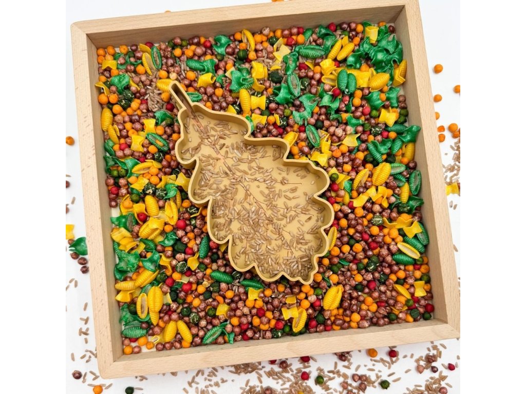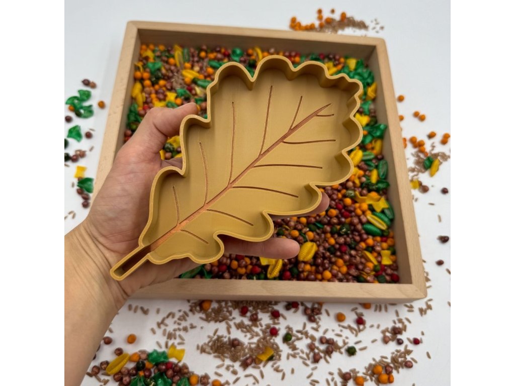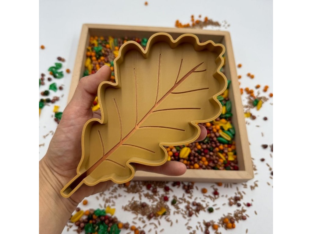 Ekologicky rozložitelný tácek ve tvaru dubového listu slouží k rozvoji jemné motoriky, fantazie, tvořivosti. Využijete ho na hru se sypkým materiálem, s modelínou, či kinetickým pískem a skvělý bude i na mokré hraní či na hru s vodními perlami. Skvěle poslouží k různým šumicím lektvarům či ke hře s otevřeným koncem.