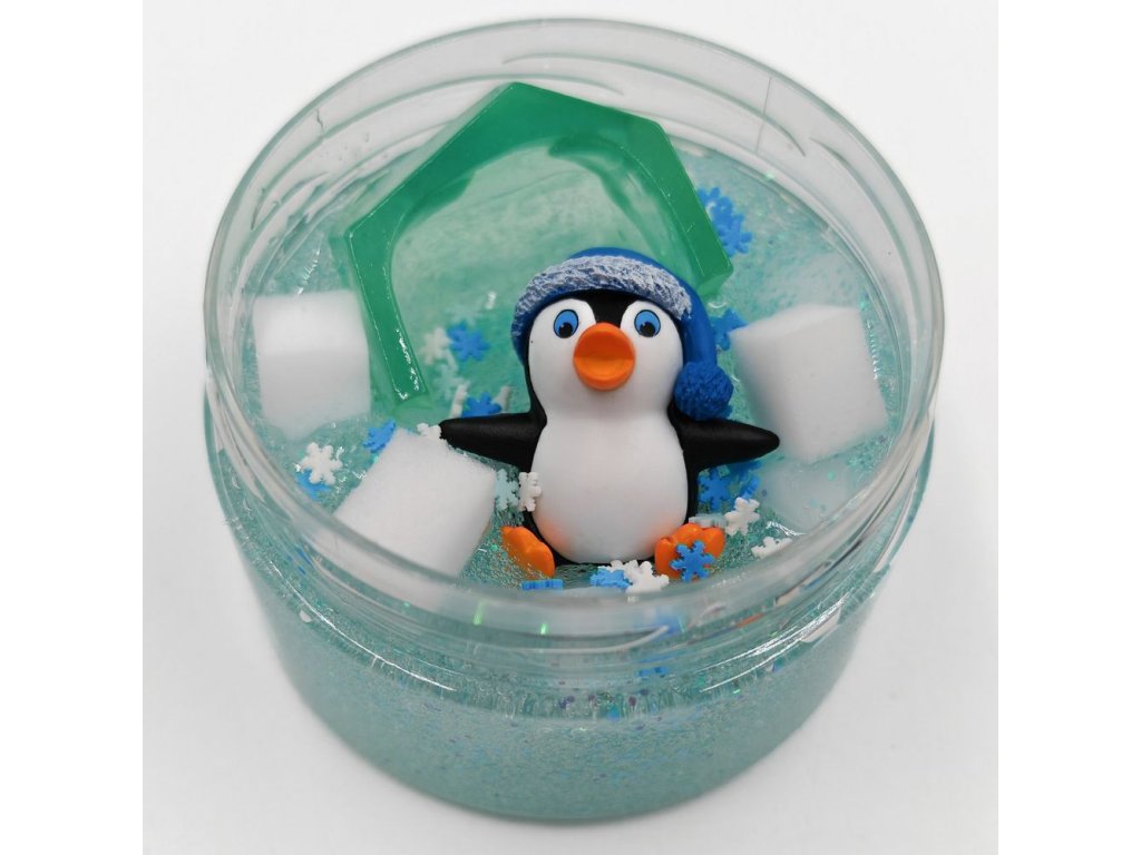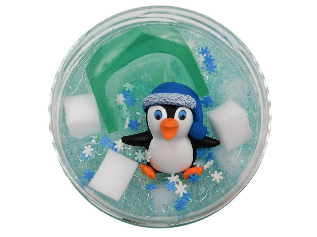 150g gelového slizu, konfety, třpytky, pěnové kostky, figurka roztomilého tučňáčka (různý), ledový domeček.
