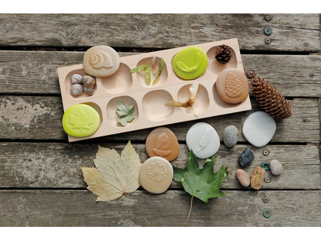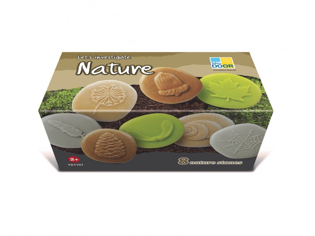 Sada obsahuje osm kamenů: žalud, semínko pampelišky, peříčko, šiška, šnečí ulita, pavučina, platanový list, semena platanu. Kameny měří cca 80 mm. Bezpečné pro děti 2+.