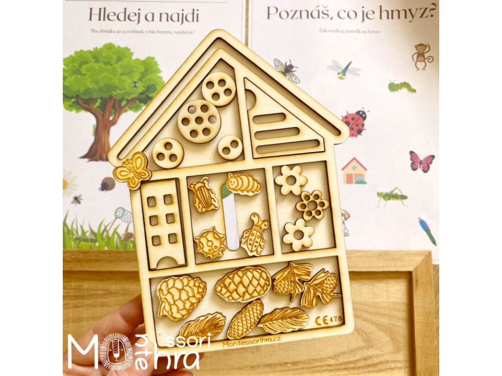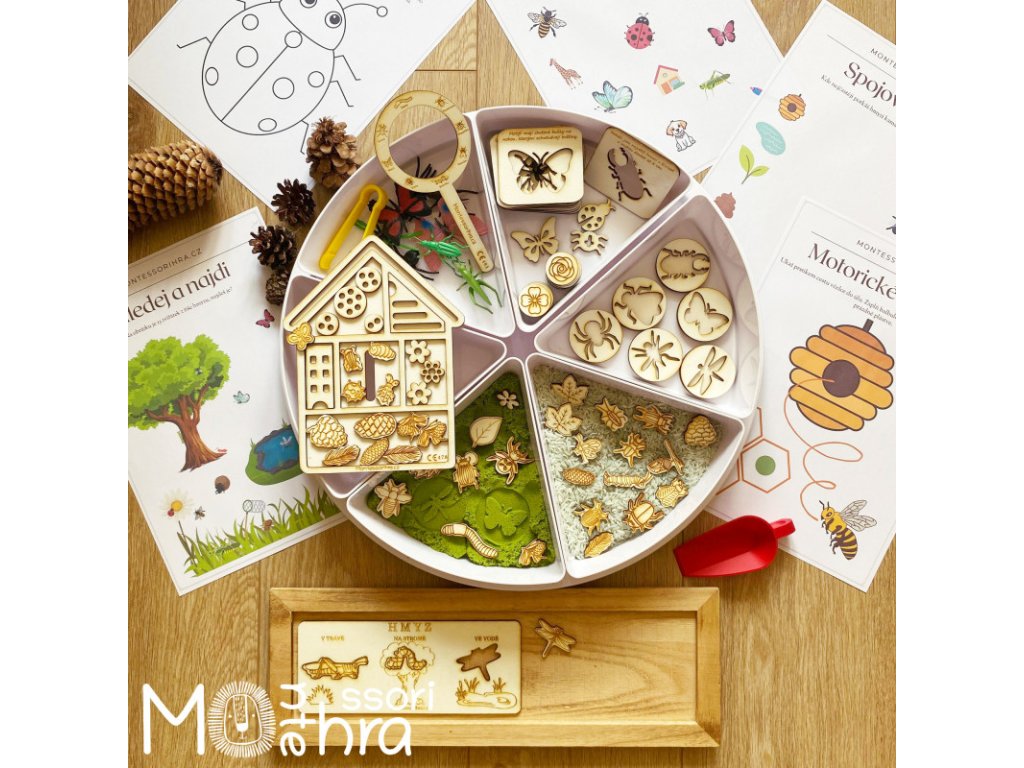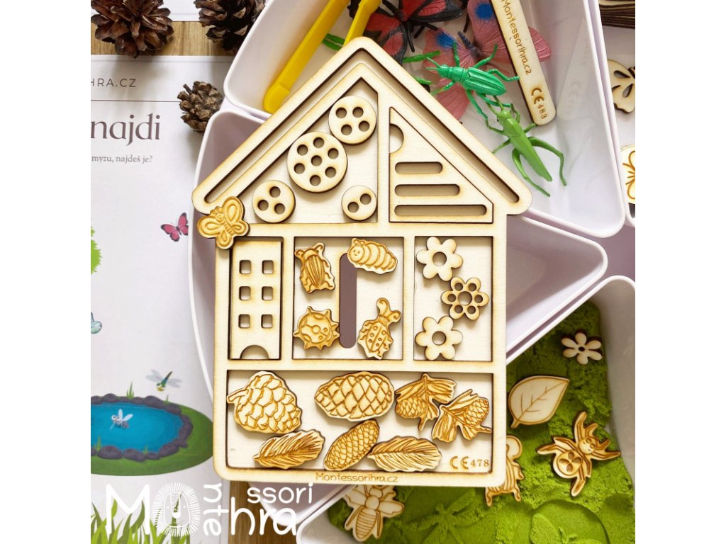 Tento jedinečný set, který můžete využít na mnoho způsobů, rozvíjí jemnou motoriku a děti se zaručeně zabaví. Dřevěný tác ve tvaru hmyzího domečku je ideální pro malé děti, které chtějí poznávat svět hmyzu.