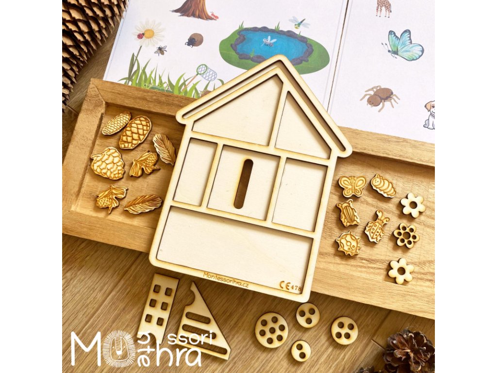 Součástí dřevěného tácu je i vkládací puzzle s částmi domečků a výřezky hmyzu, přírodnin a dalších tvarů.