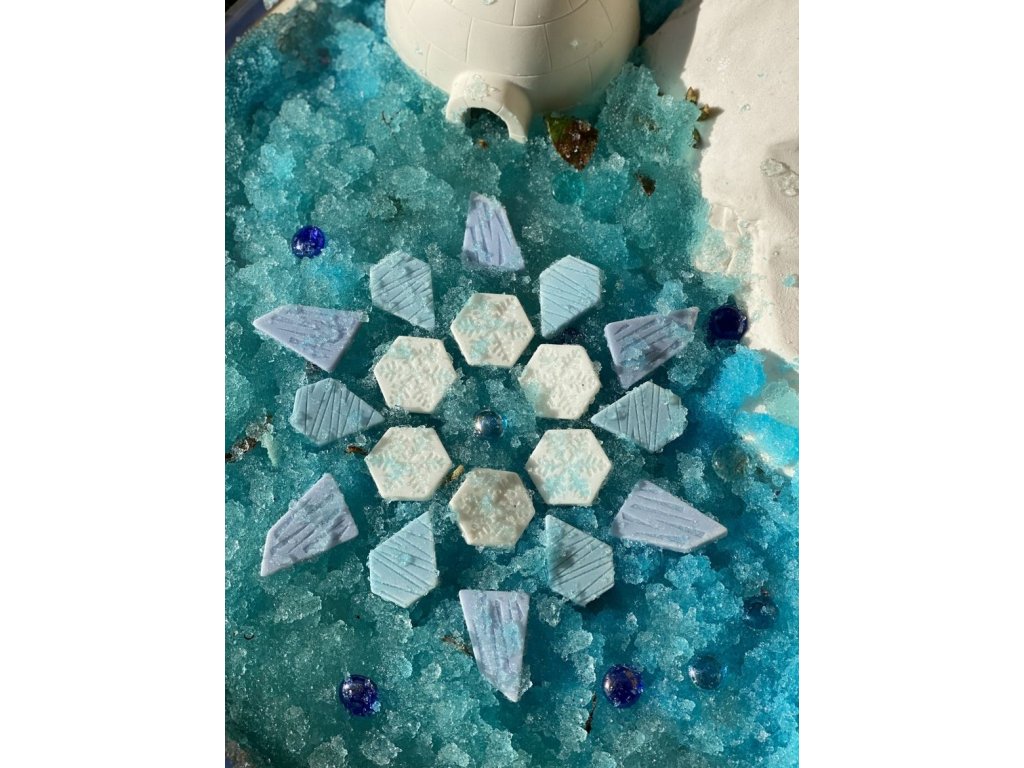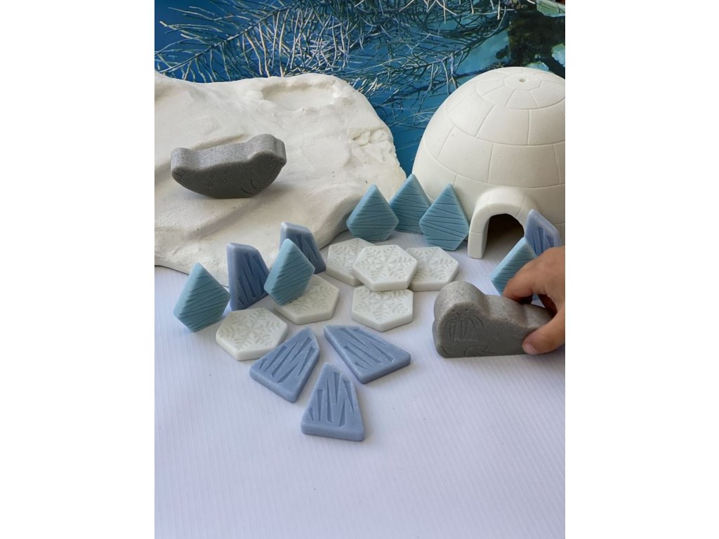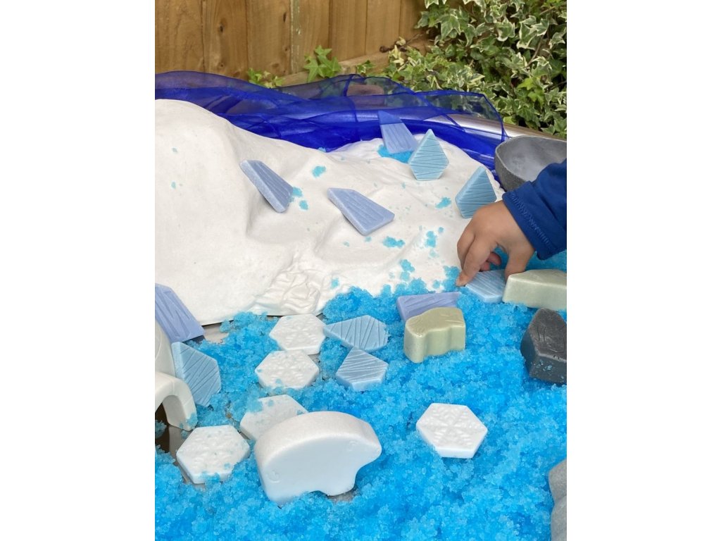 Hrací kameny od značky Yellow Door mohou děti použít jako tyčící se ledovce, plovoucí ledové kry a hluboký sníh poskytují okamžité prostředí pro mrazivé, jazykově bohaté vyprávění.