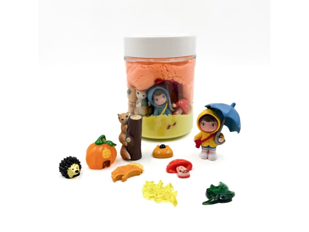 Kinetický písek je oblíbeným smyslovým materiálem jak u dětí, tak u dospělých. Tato dóza navíc obsahuje hračky, které dělají hru zajímavější. Do dózy jsme schovaly kousky podzimu.