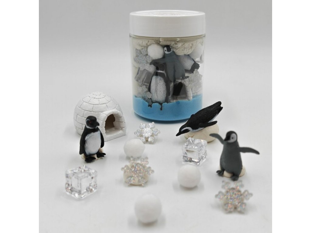 Kinetický písek je oblíbeným smyslovým materiálem jak u dětí, tak u dospělých. Tato dóza obsahuje realistické figurky tučňáků, kteří se zabydlí v připraveném obydlí.