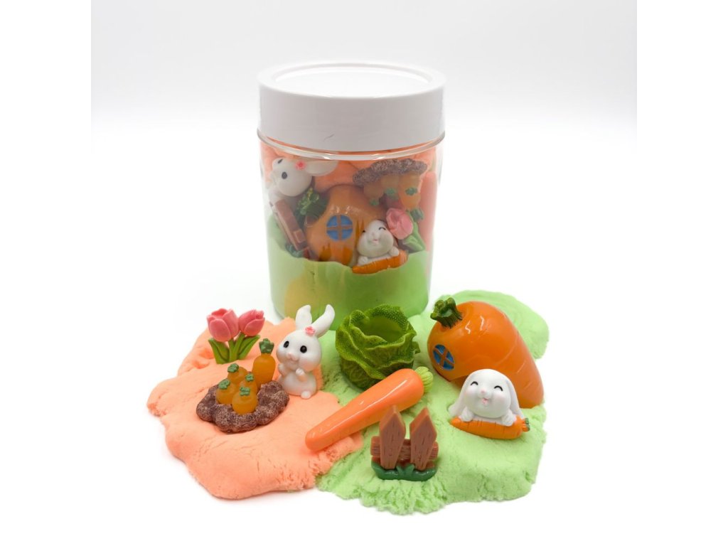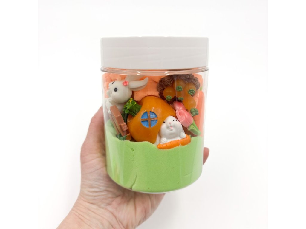 Kinetický písek je oblíbeným smyslovým materiálem jak u dětí, tak u dospělých. Tato dóza obsahuje roztomilé zajíčky, kteří se chystají na Velikonoce.