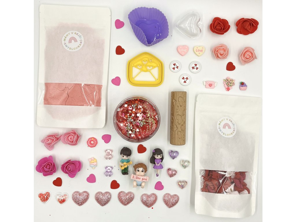 Ve smysloboxu láska najdete úplně vše – mamolínu, sypký smyslový materiál, kinetický písek, náčiní ke smyslohraní, vykrajovátko a spoustu doplňků k danému tématu.