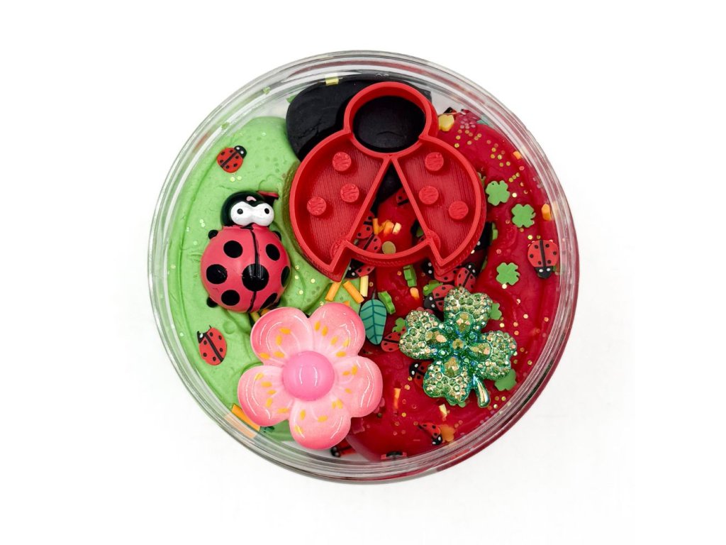 250g domácí voňavé modelíny tří barev, třpytky, konfety, beruška, eco vykrajovátko beruška, kytička, čtyřlístek
