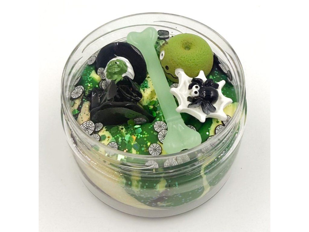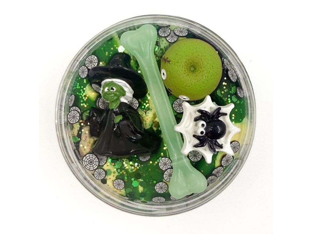 250g tříbarevné domácí modelíny, třpytky, konfety, čarodějnice, kost, pavouk, dortík