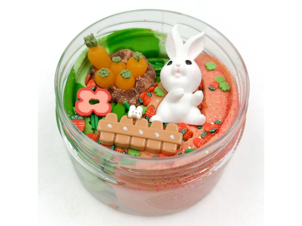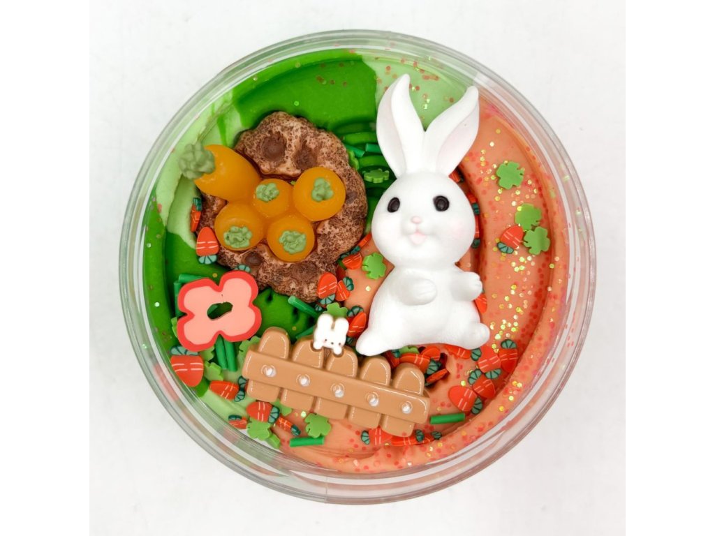 250g měkkoučké domácí modelíny ve třech barvách, třpytky, konfety, zajíček, plot a záhonek s mrkvičkami