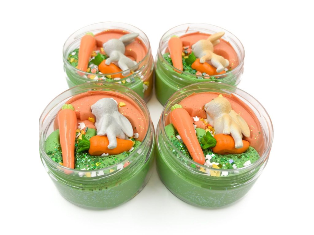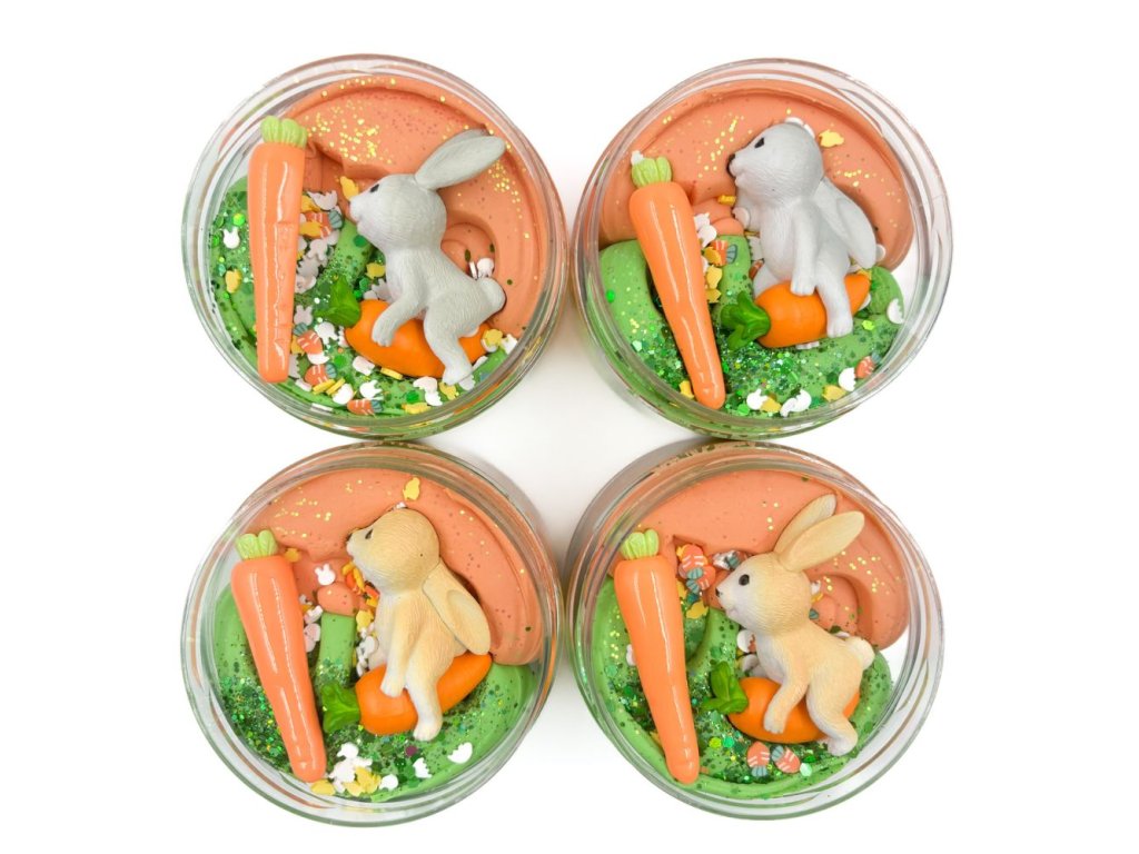 250g měkkoučké domácí modelíny ve dvou pastelových barvách, třpytky, konfety, zajíc, mrkvička