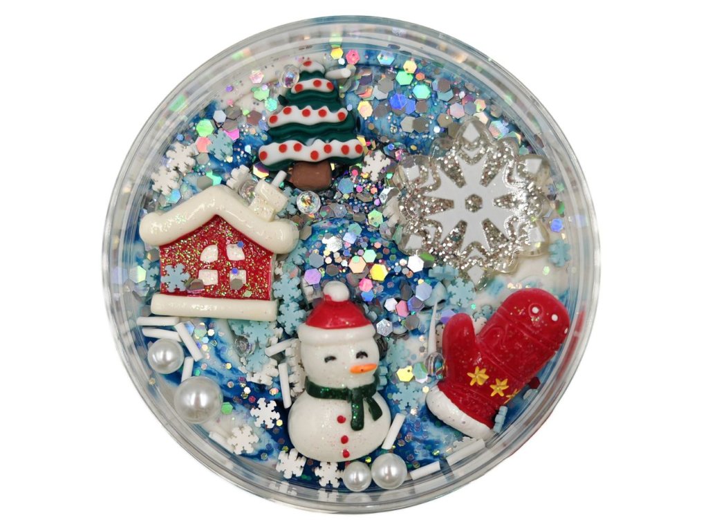 250g měkkoučké domácí dvoubarevné modelíny, třpytky, konfety, 5ks dekorací - sněhulák, chaloupka, stromeček, rukavice, vločka.