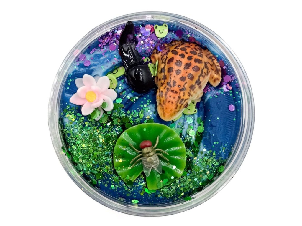 250g dvoubarevné modelíny, třpytky, konfety, figurka žáby, figurka pulce (různé velikosti a stádia vývoje), leknín, moucha