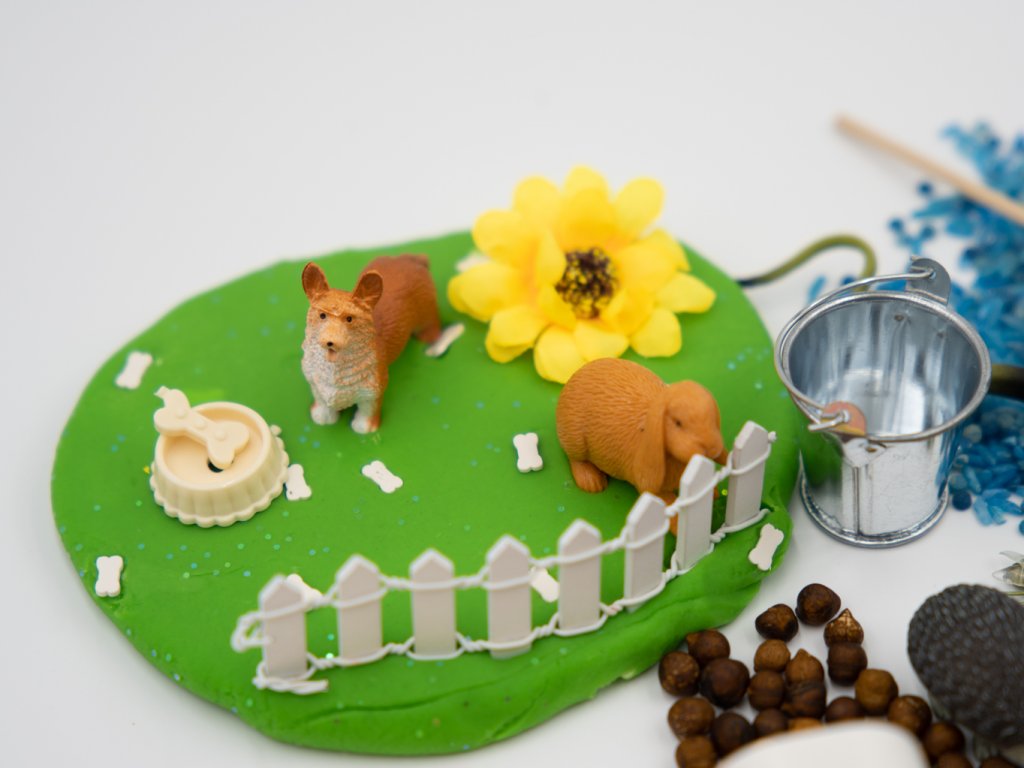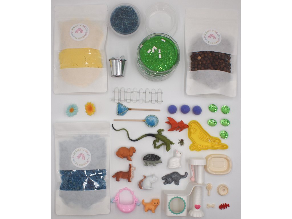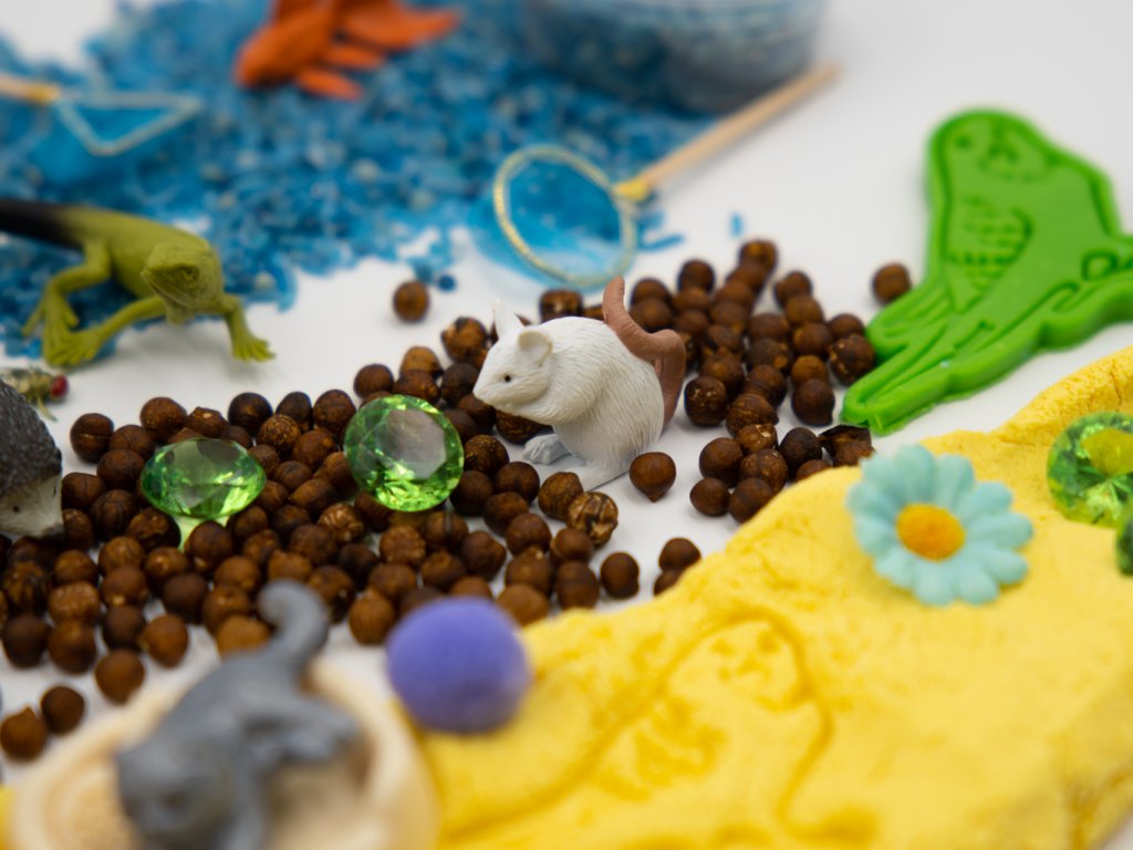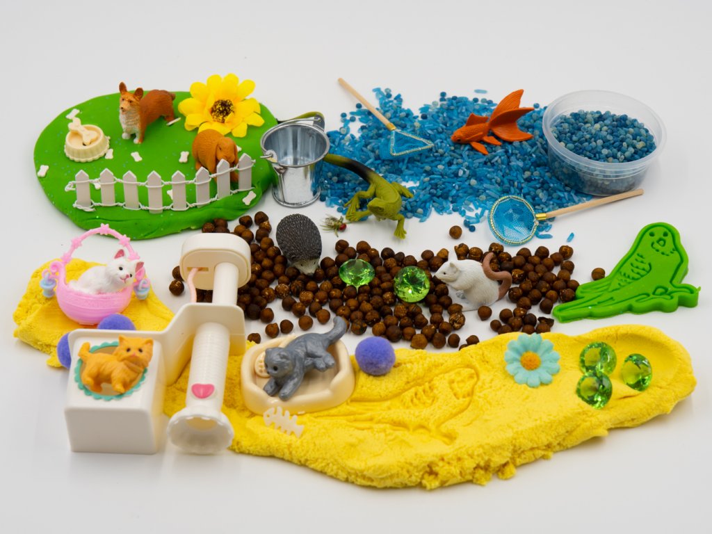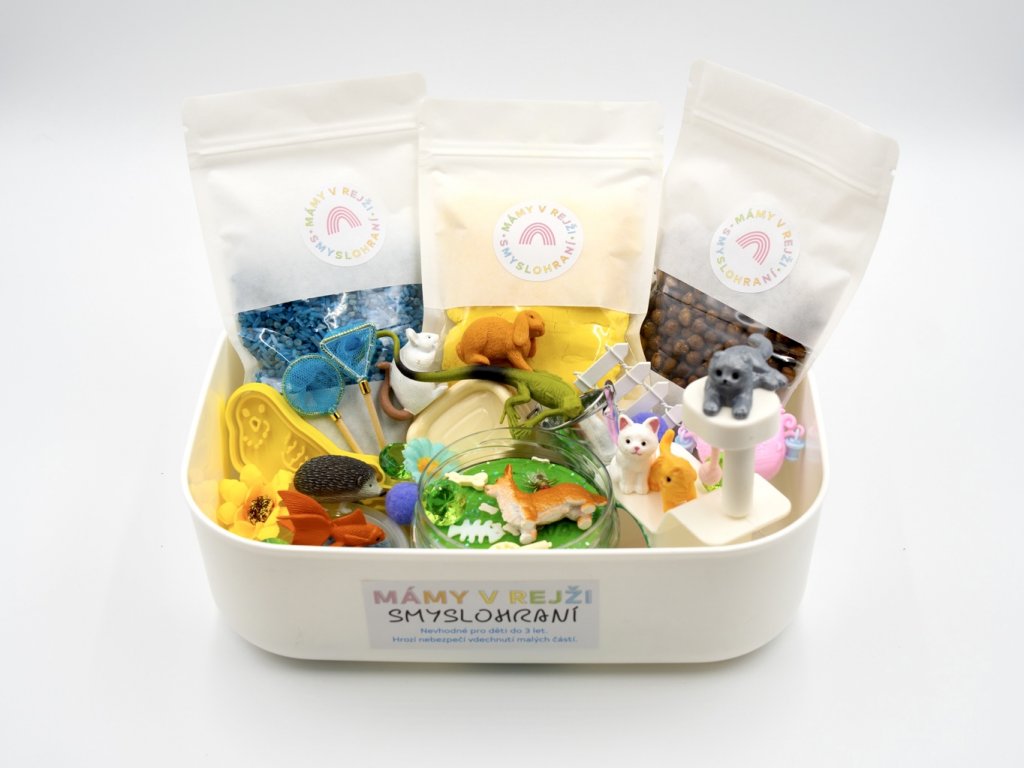 Smyslohraní se zvířátky má největší úspěch hlavně u menších dětí, kterým je vhodné ukazovat věci z reálného života. Zvířata, které můžete chovat doma, jsou nejideálnější variantou. Ve smysloboxu najdete náš boží kinetický písek a modelínu, a také cizrnu s tarhoňou barvené potravinářským barvivem. Roztomilé kočičky se vyhřívají na škrabadle, mezitím se ještěrka či žabka snaží ulovit mouchu.