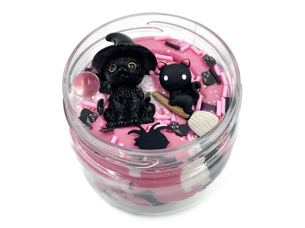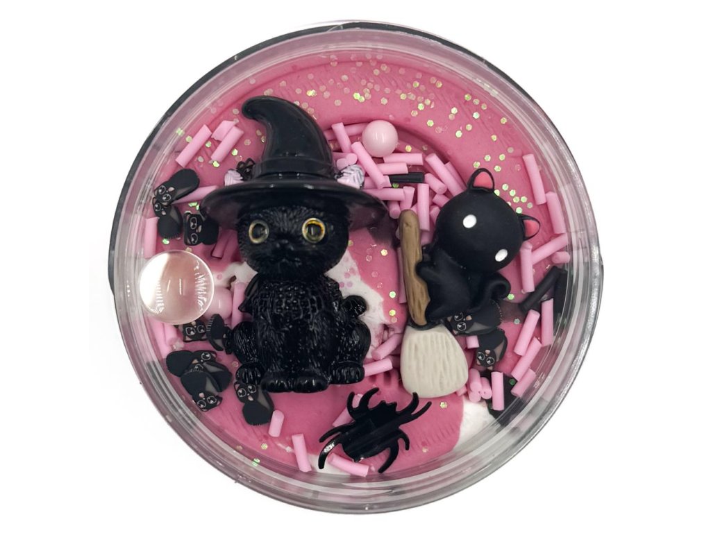 125g domácí modelíny tří barev, třpytky, konfety, kočička, dekorace kočička na koštěti