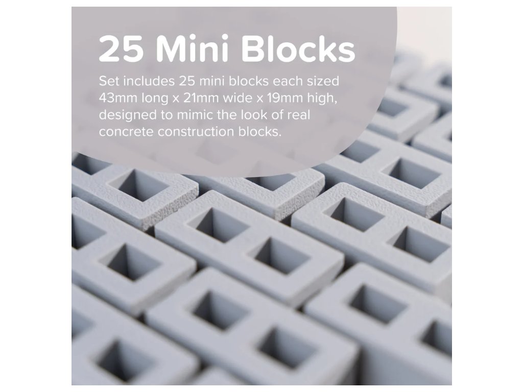 Sada obsahuje 25 mini bloků, každý o velikosti 43 mm délka x 21 mm šířka x 19 mm výška navržených tak, aby napodobovaly vzhled skutečných betonových stavebních bloků.