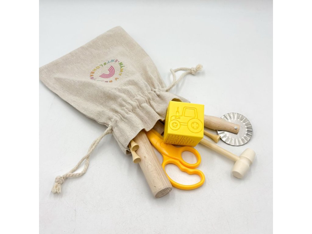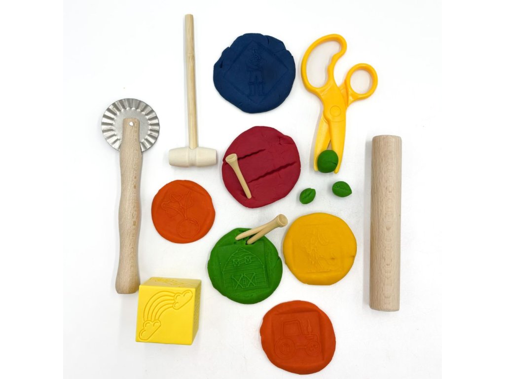 Sadu jsme připravily speciálně pro hraní s modelínou. Dle našich zkušeností právě tyto pomůcky báječně doplní a rozvinou hru. Kostka je obtiskávací a zároveň se s ní tvoří příběhy – rozvíjíte se sadou slovní zásobu, fantazii, tvořivost a jemnou motoriku.