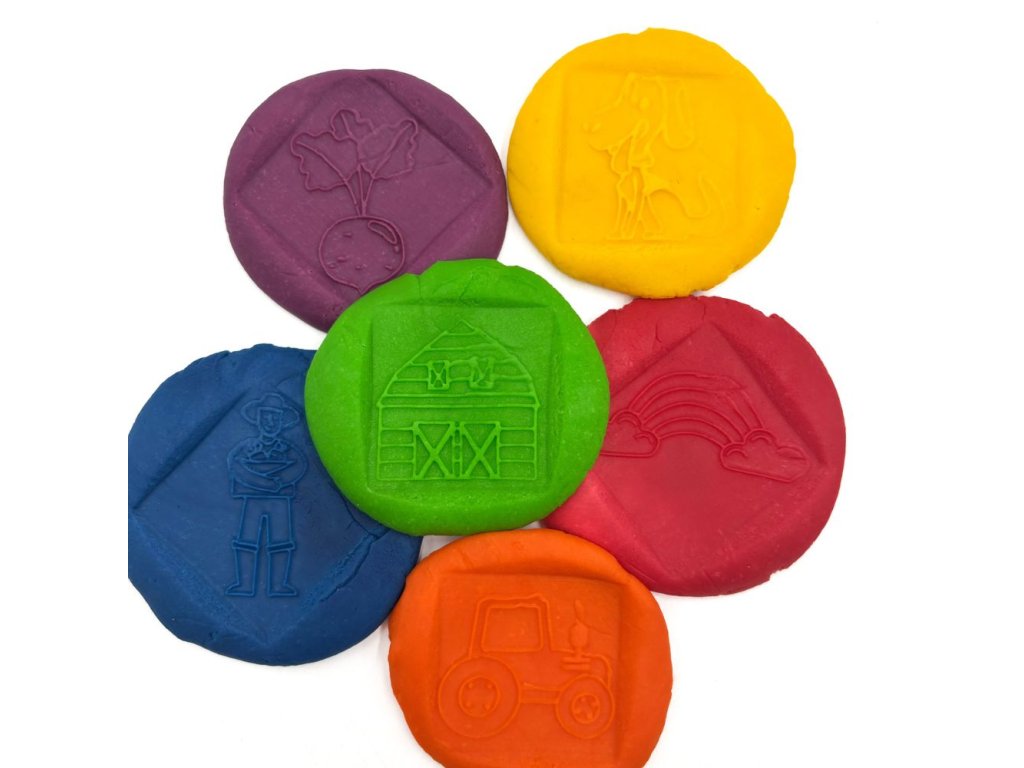 obtiskávací kostka z PLA se 6 obrázky (téma farma - obsahuje jídlo, dopravní prostředek, osobu, zvíře, počasí, budovu - skvělé na rozvoj slovní zásoby a tvoření příběhů)
