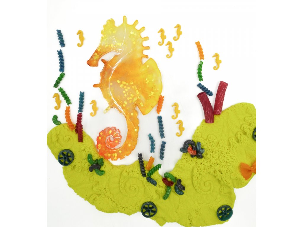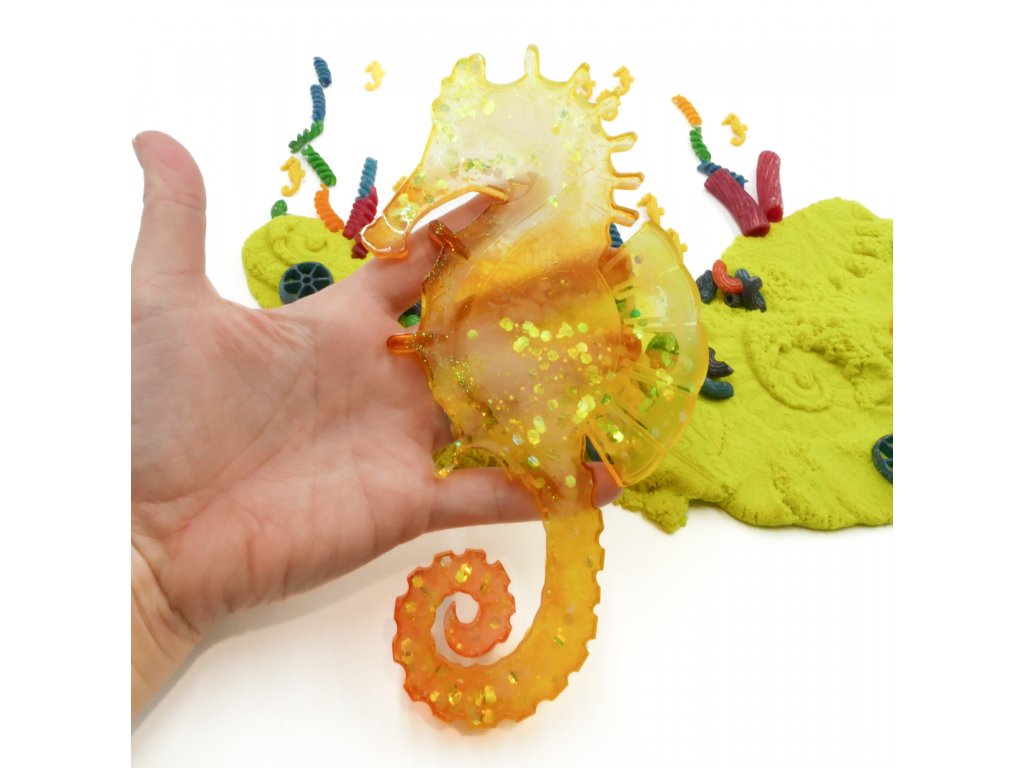 Nádherný mořský koník z pryskyřice pomůže rozehrát mořské smyslohraní. Můžete ho obtisknout do modelíny, či kinetického písku. Vysypávat sypkým materiálem, využít jako tácek k vodním perlám, či jiným mokrým hrátkám.