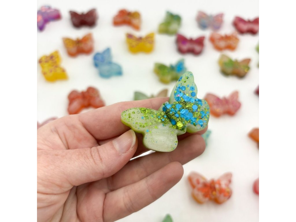 Krásný motýlek z pryskyřice. Děláme je v různých barvách a s různými třpytkami. Pokud máte barevné přání, napište do poznámky. Pokud zrovna nebude skladem, počítejte s delším dodáním. Jinak volíme dle skladových zásob.