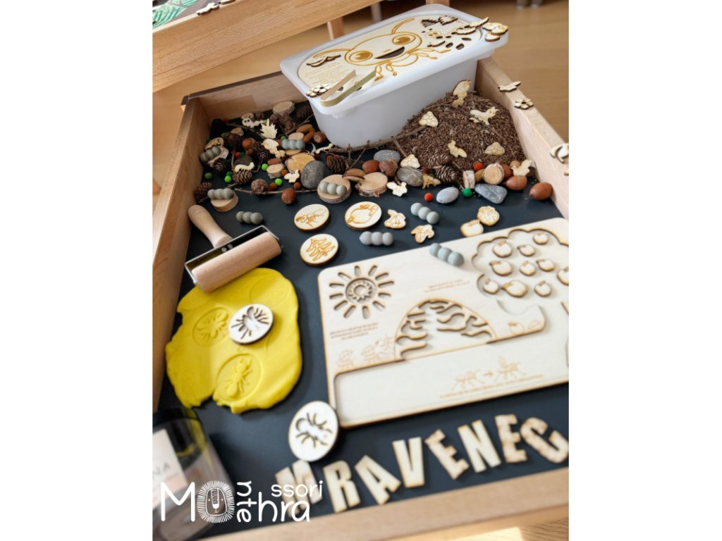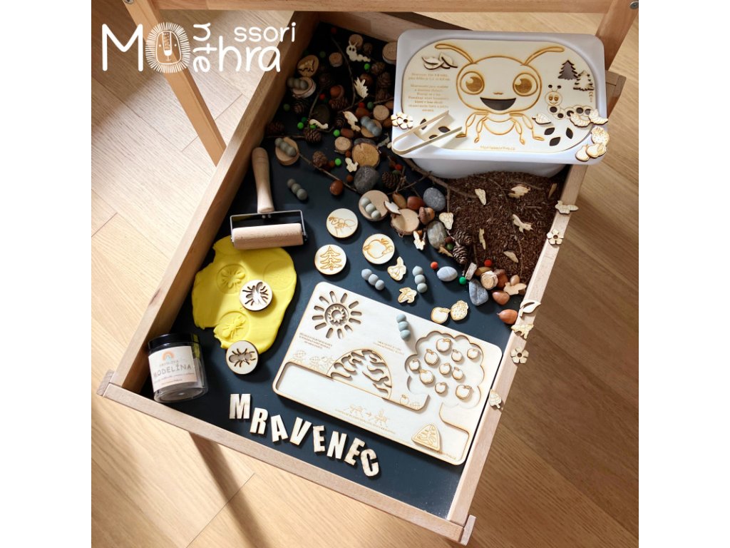 Sensory set Mravenec je skvělou vzdělávací pomůckou pro děti (mohou skládat a utvářet příběhy, prosvětlovat ve tmě kartičky, učit se nové věci o mravencích, trénovat jemnou motoriku vhazováním předmětů do otvorů a mnoho dalšího.).