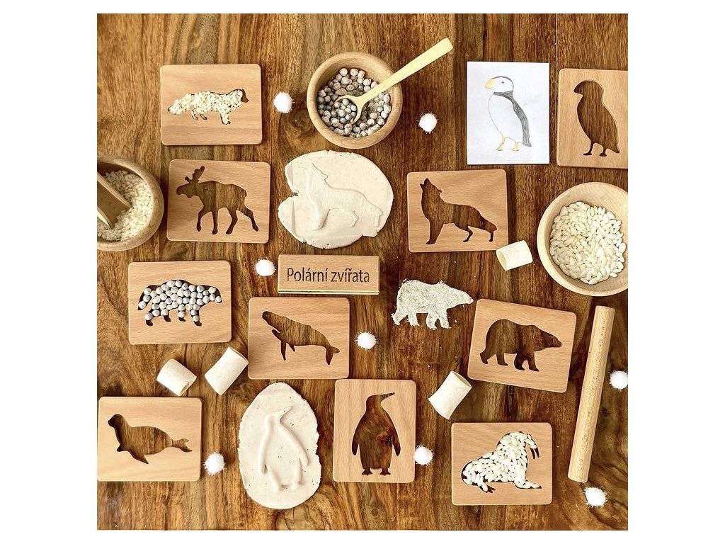 Kartičky využijete při hře skrze smysly. Sypáním rýže nebo obarvené soli či cizrny získáte krásné obrázky zvířátek, můžete výřezy vystlat modelínou nebo je v ní obtisknout. K destičkám můžou děti přiřazovat figurky nebo obrázky. Skvělé budou na obkreslování a na hraní se stíny! A samozřejmě v neposlední řadě na poznávání polárního světa.