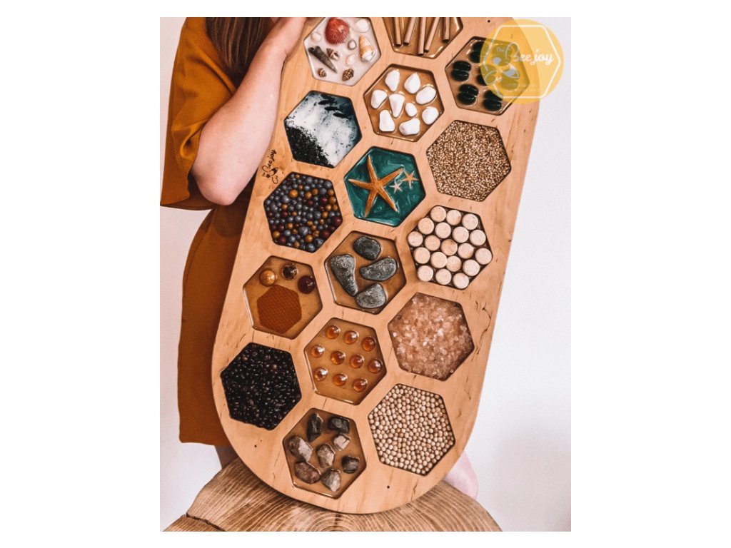 Spousta přirozeného smyslového vjemu, spousta textur, barev, spousta škrábání, drhnutí, mačkání a spousta radosti na vašich tvářích!! Všechny výplně byly dokonale opracovány, aby potěšily ruce i oči. Každá šestiúhelníková buňka má jiný příběh a jiný hmatový potenciál. A s tím vším to vypadá prostě nádherně.