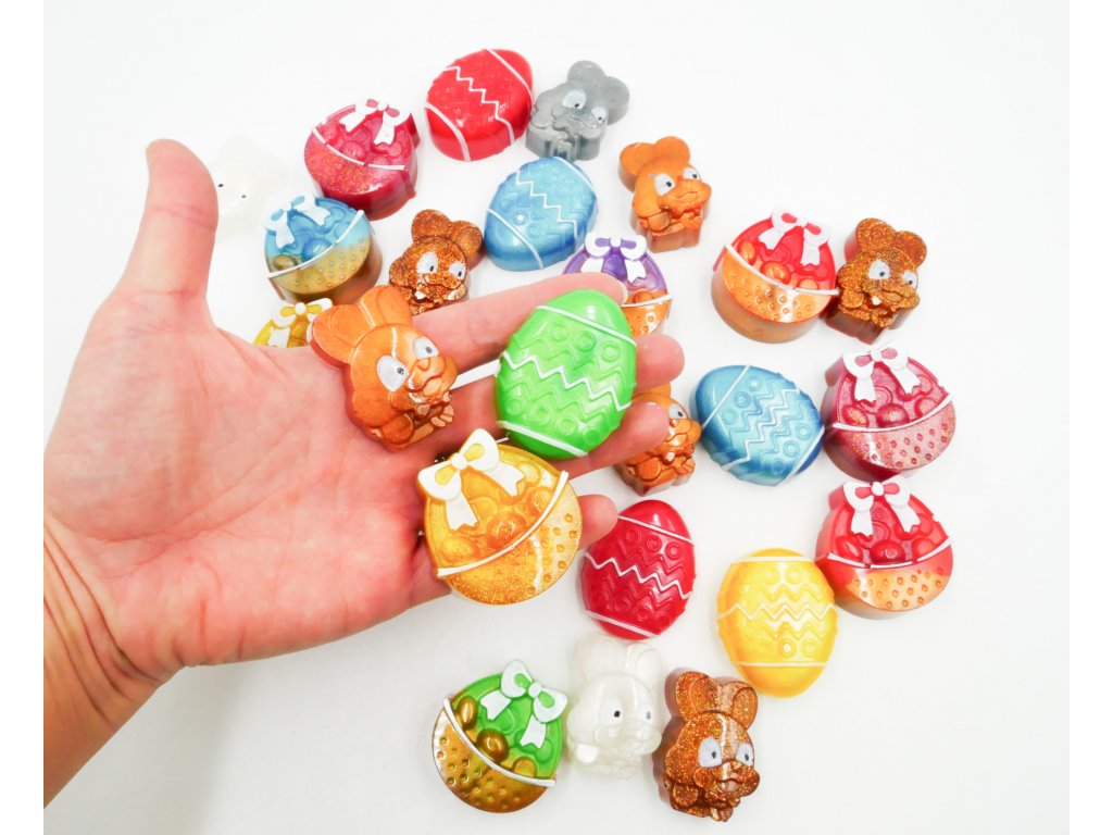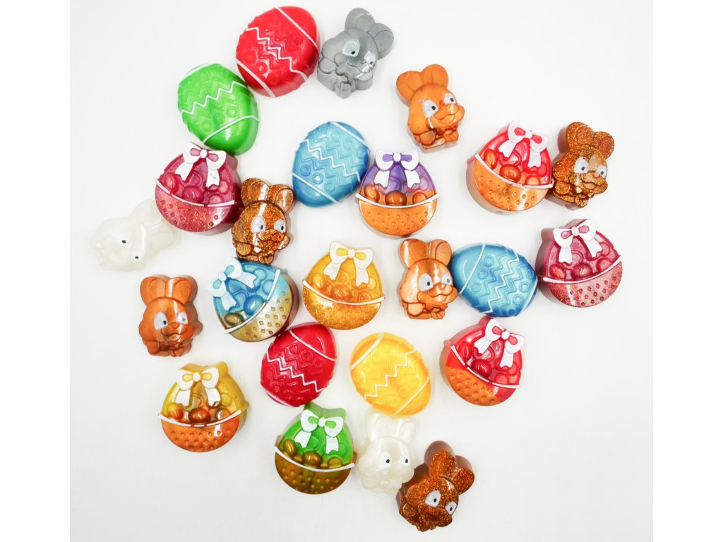 Velikonoční barevné vajíčko, zajíček a košík z pryskyřice potěší každé dítě a můžete je darovat jako výslužku koledníkům. Tohle se totiž nezkazí.