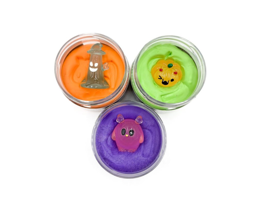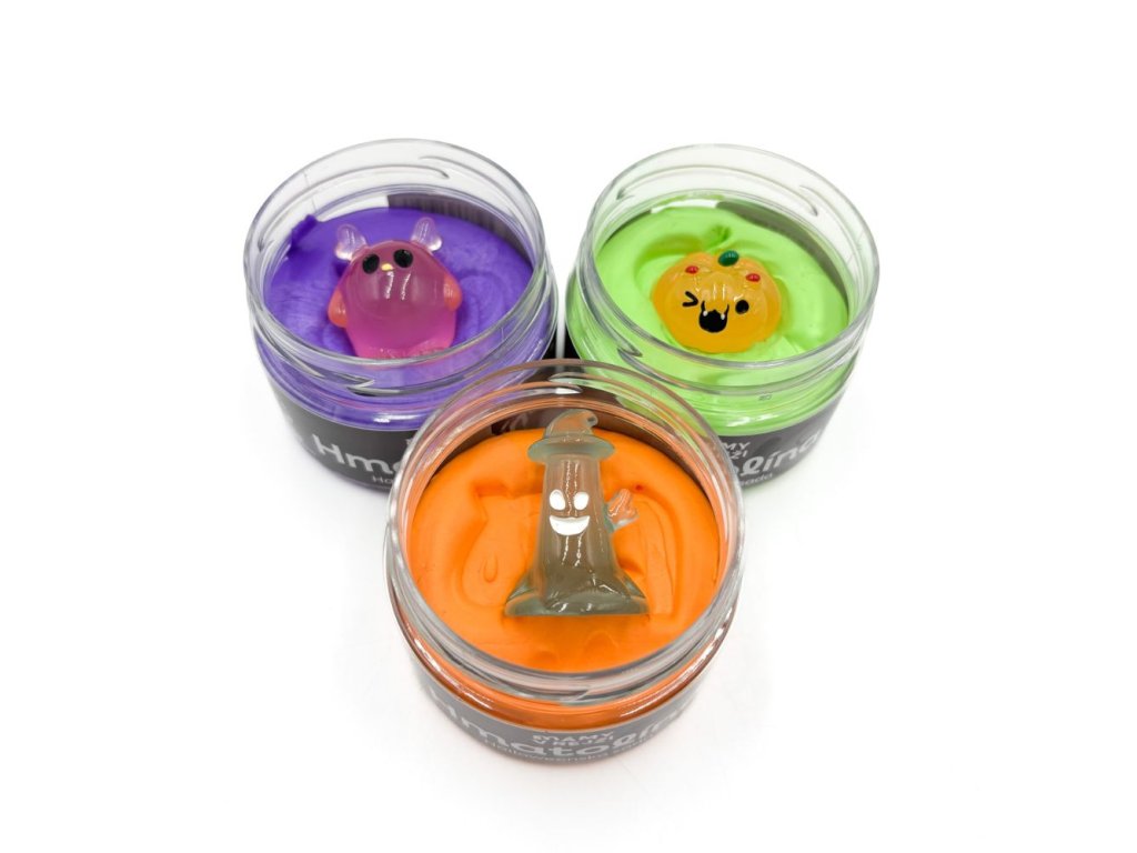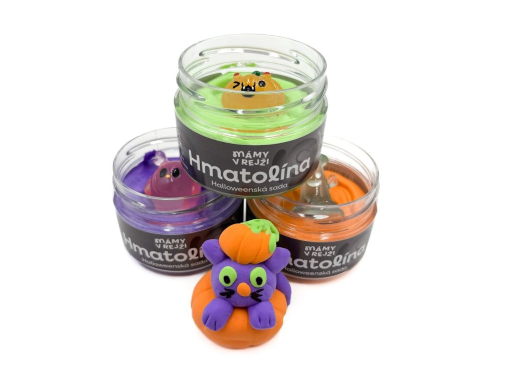 Sada obsahuje tři barvy hmatolín: zelená, fialová, oranžová + 3ks ve tmě svítících halloweenských dekorací