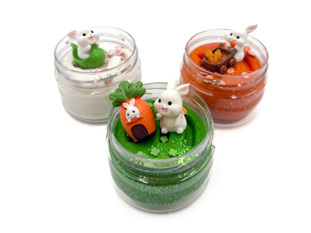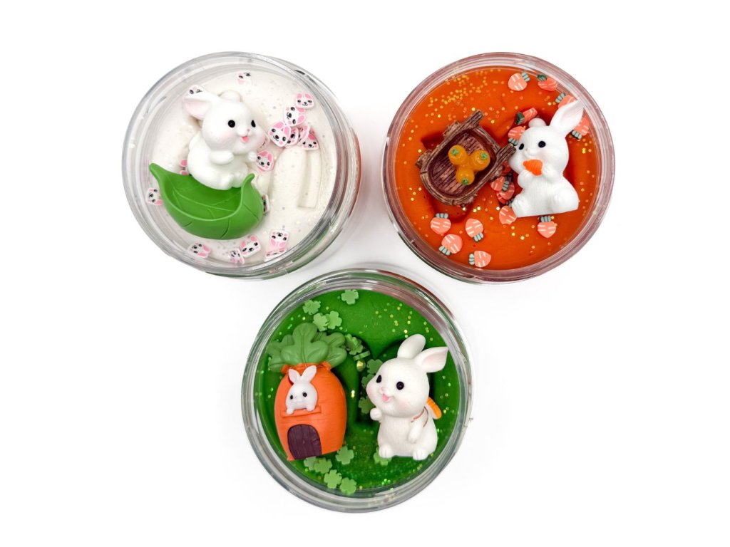 3x 125g měkkoučké domácí modelíny, třpytky, konfety, zajíček 3ks, list, vozík s mrkví, mrkvový domeček