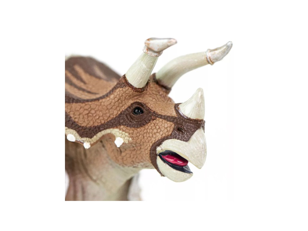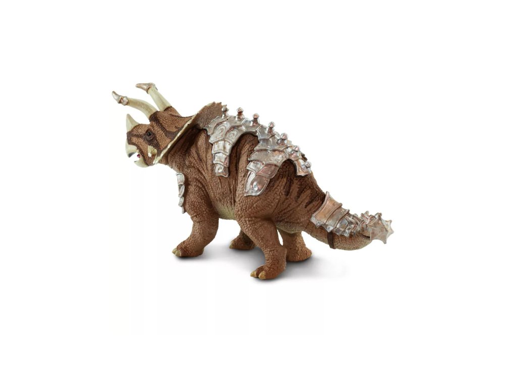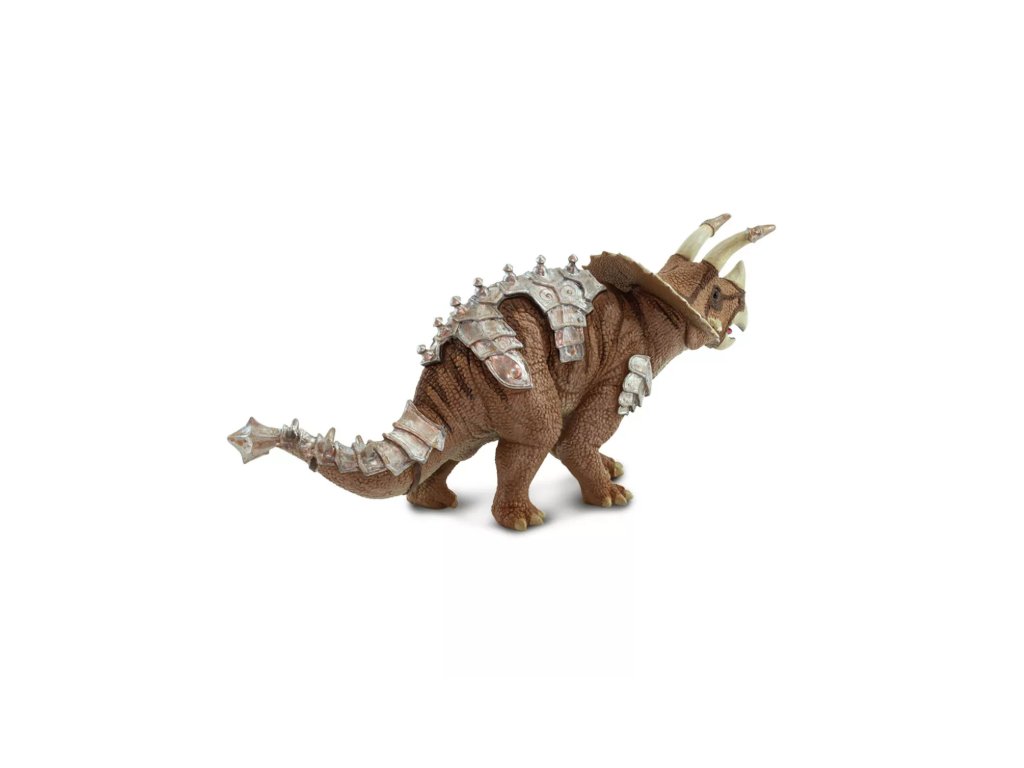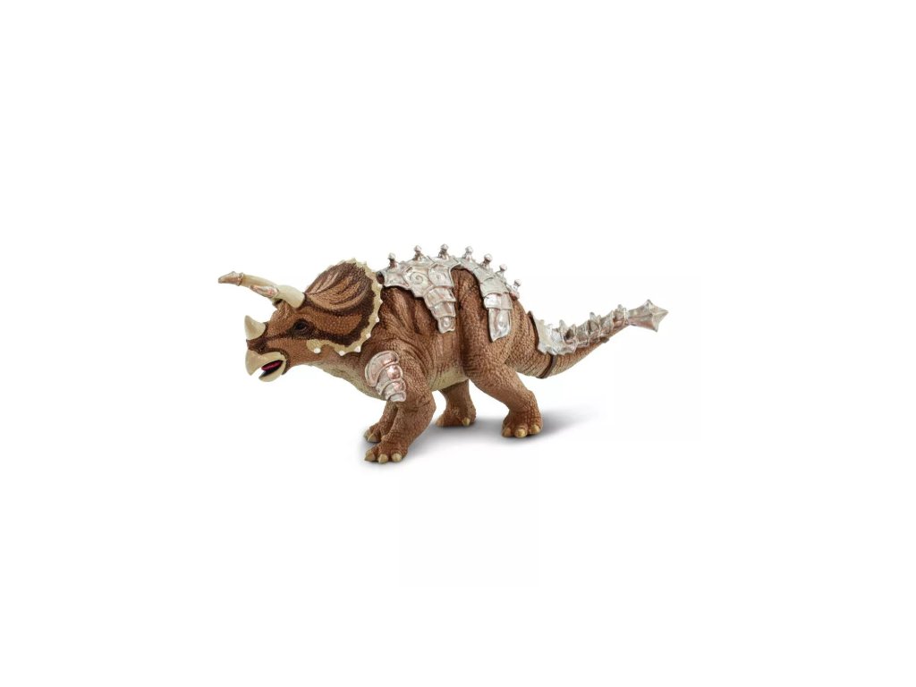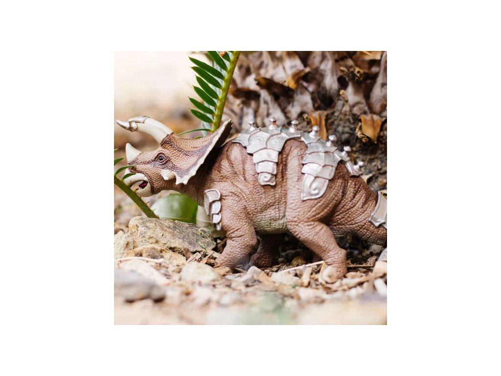 Figurka obrněného Triceratopse, který nyní zvýrazňuje svou již tak impozantní přírodní výzbroj s paličkovaným ocasem a novým lesklým brněním, které chrání jeho záda a boky.