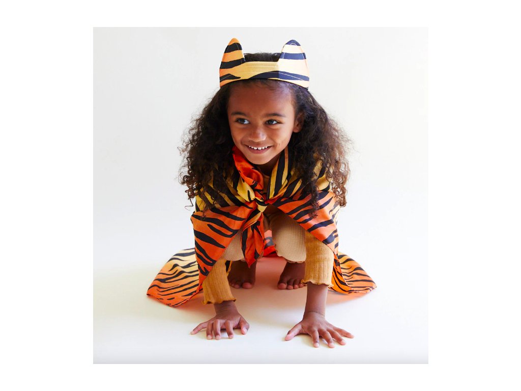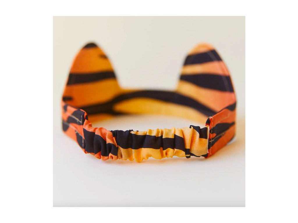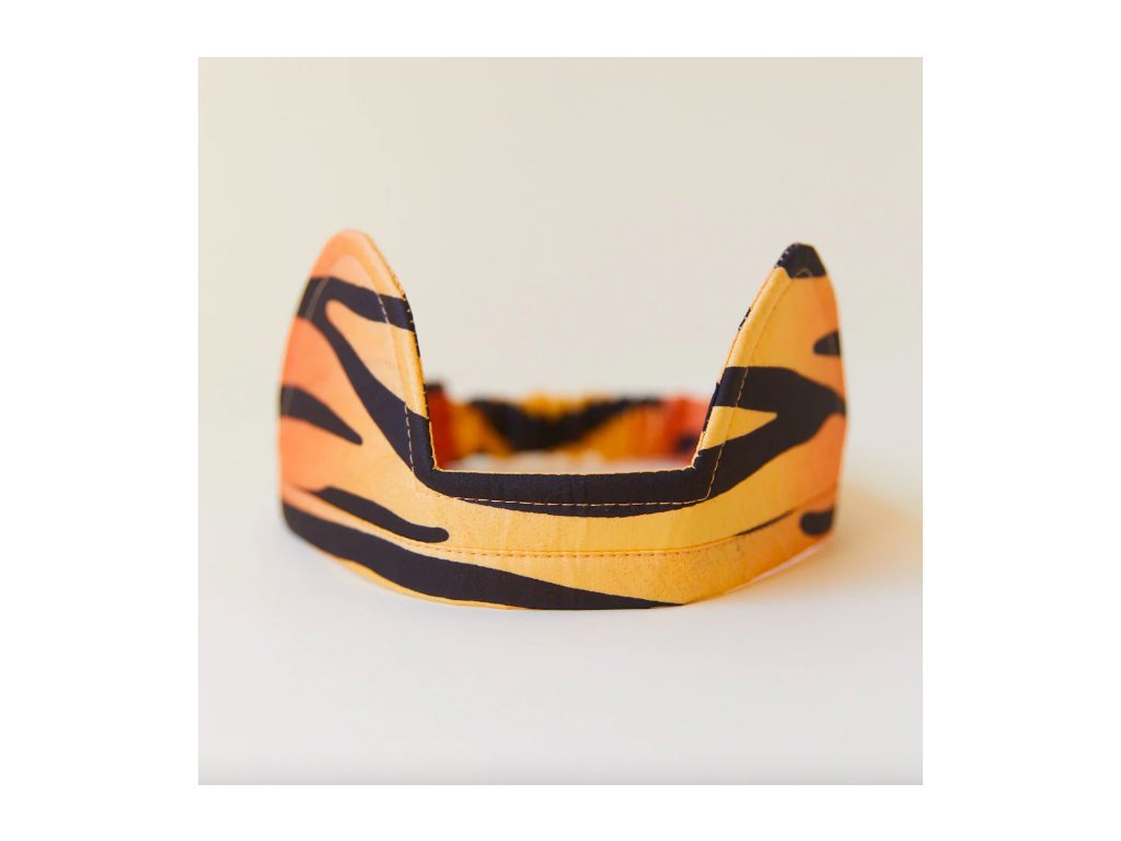 Krásná čelenka pro každého ctižádostivého tygra. Díky zadní části na gumičku dokonale padnou na jakkoli velkou hlavu.Nádherný vzor černých pruhů na zlatooranžovém pozadí je vytištěn na 100% čistém morušovém hedvábí. Děti je rády využijí při svých každodenních hrách s převleky plných fantazie. Krásně se hodí k hedvábným tygřím kalhotám.