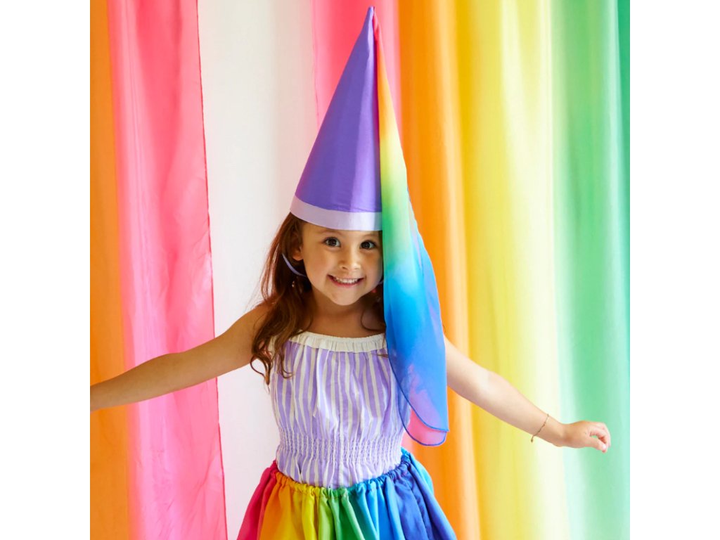Duhový klobouk je vyroben ze 100% čistého morušového hedvábí a je ideální nejen pro kouzelníka, balerínu, šaška nebo cirkusového umělce ale i pro další pohádkové postavy, které si Vaše dítě dokáže představit! Tento klobouk je doplněk, který vydrží po celé dětství a Vy ho využijete znovu a znovu!