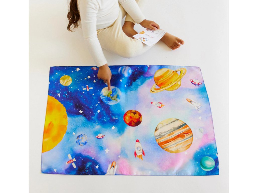 Nový design s originálními, podmanivými uměleckými díly a ilustrovanou kartou, která inspiruje k nekonečné hře a zkoumání. Tento šátek povzbudí Vaše dítě k prozkoumávání rozlehlosti vesmíru.