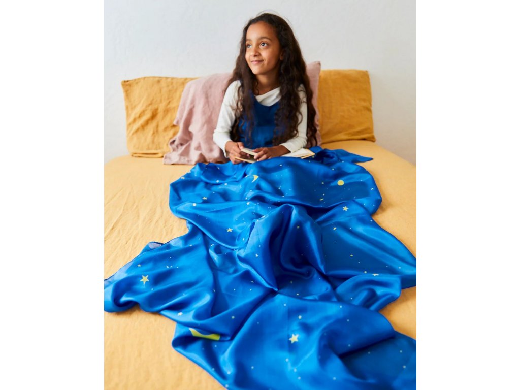 Obří hedvábné šátky měří cca 88x177 cm. Jsou ideální ke hře padákem (parachute play), dají se použít jako nebesa nad postel nebo stříška při hraní, ke stavbě hradů nebo jako pozadí pro loutkové divadlo. Vhodné ke kombinaci s kolíčky na hraní.