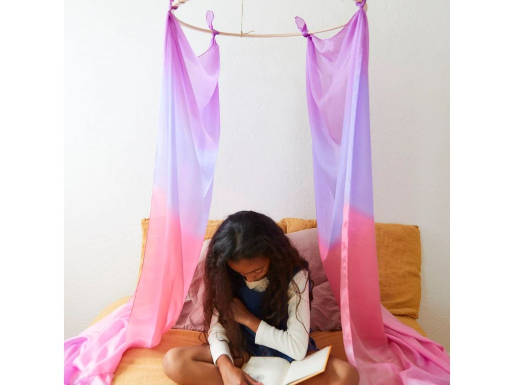 Obří hedvábné šátky měří cca 88x177 cm. Jsou ideální ke hře padákem (parachute play), dají se použít jako nebesa nad postel nebo stříška při hraní, ke stavbě hradů nebo jako pozadí pro loutkové divadlo. Vhodné ke kombinaci s kolíčky na hraní.