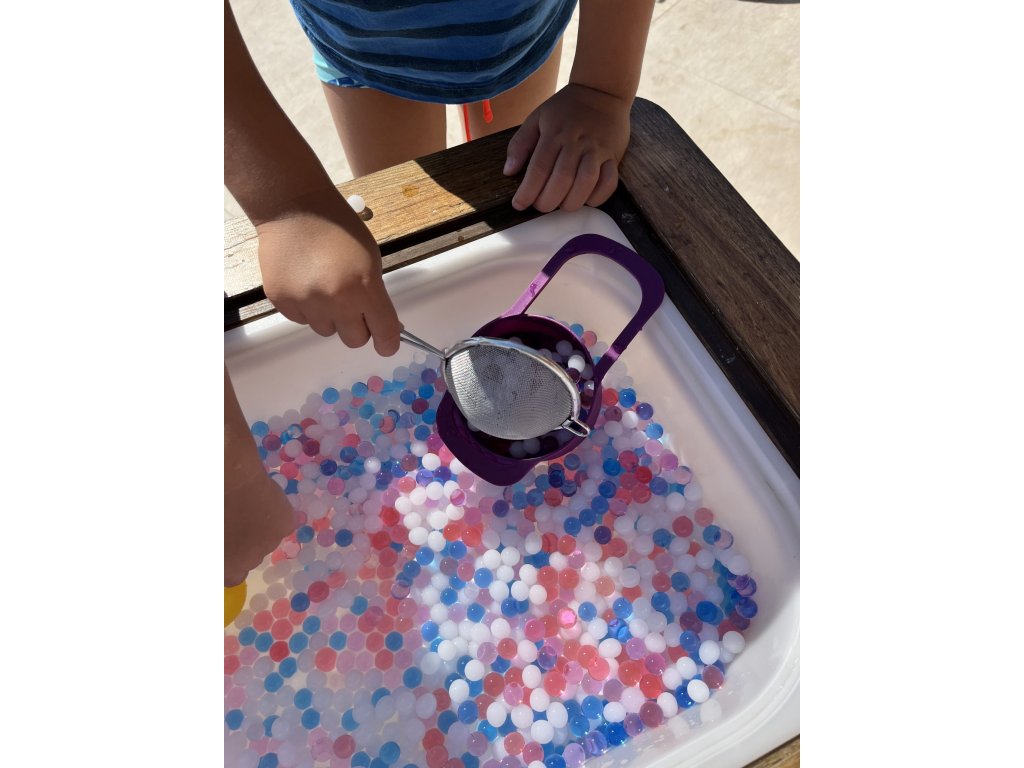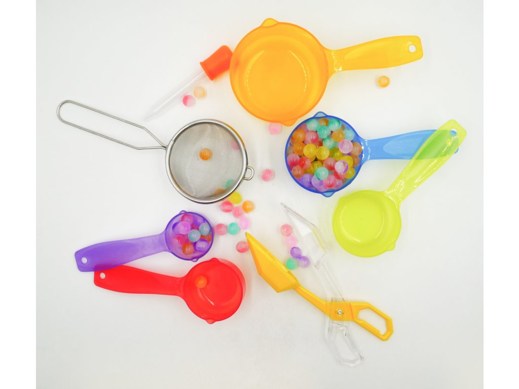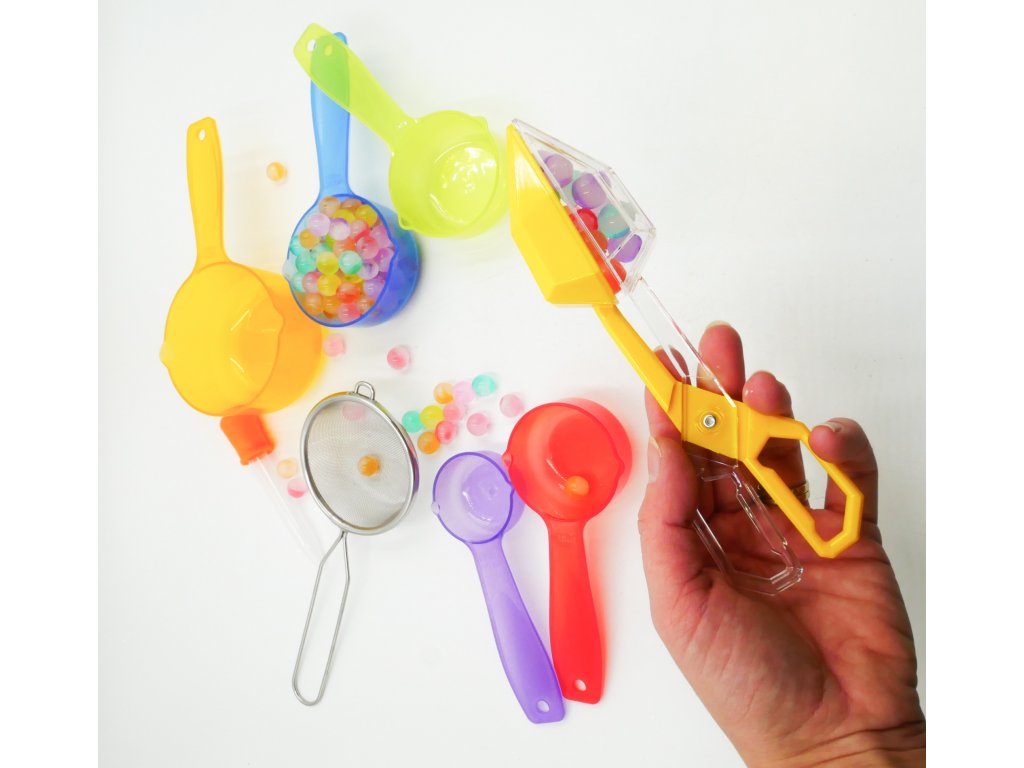 Díky této sadě si děti velmi dobře procvičí jemnou motoriku, prozkoumají tekoucí vodu, padající perly či jiný smyslový materiál. Naučí se nasávat vodu do kapátka a přenášet ji. Mokré a patlavé aktivity děti velmi baví, tak hurá na ně!