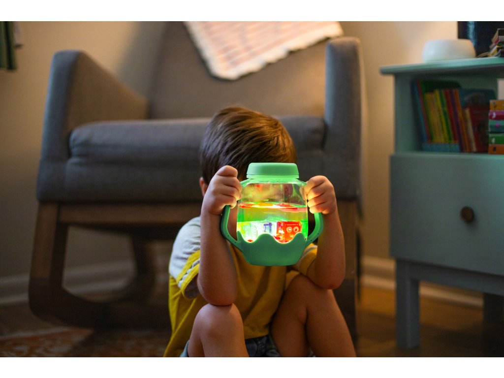 Nádobu nemusíte naplnit celou. Nejlepší zábava je sledovat plovoucí smyslové přírůstky plovoucí na vodě nebo klesající ke dnu. Zkuste nádobou zatřást a uvidíte vlny a rozbouřenou vodu. Když nádobu otočíte dnem vzhůru :) Přestane svítit.