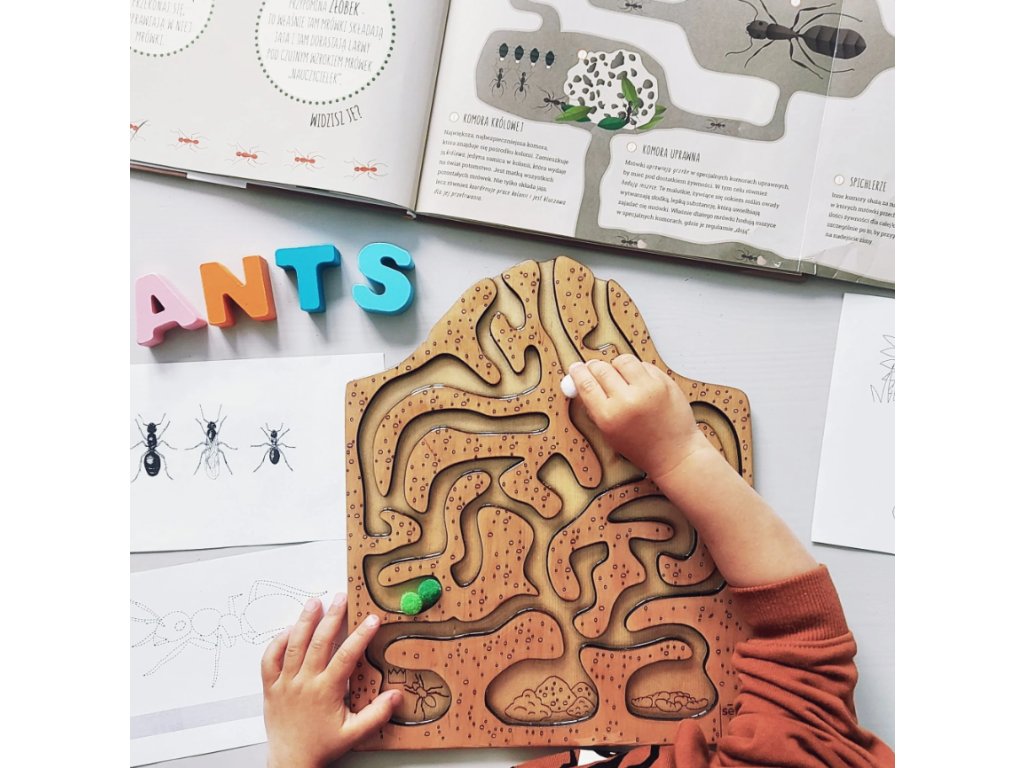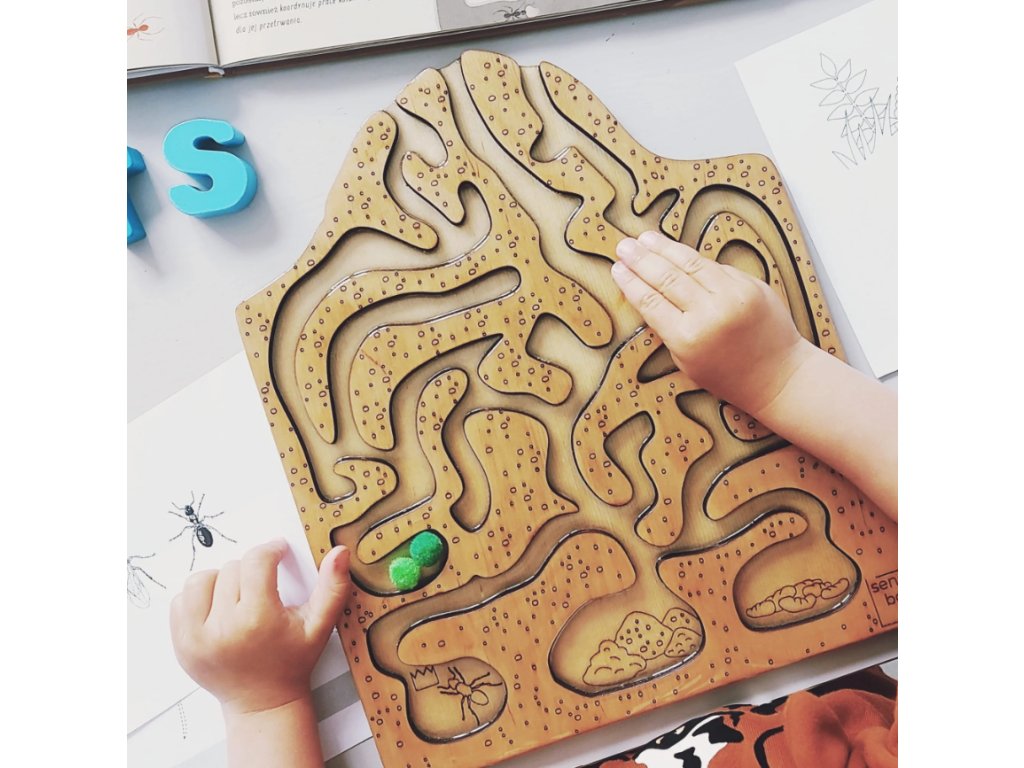Tento smyslový tácek je kombinací průřezu mraveniště a bludiště. Tři vchody, tři cílové komory s královnou, vejci a larvami.
