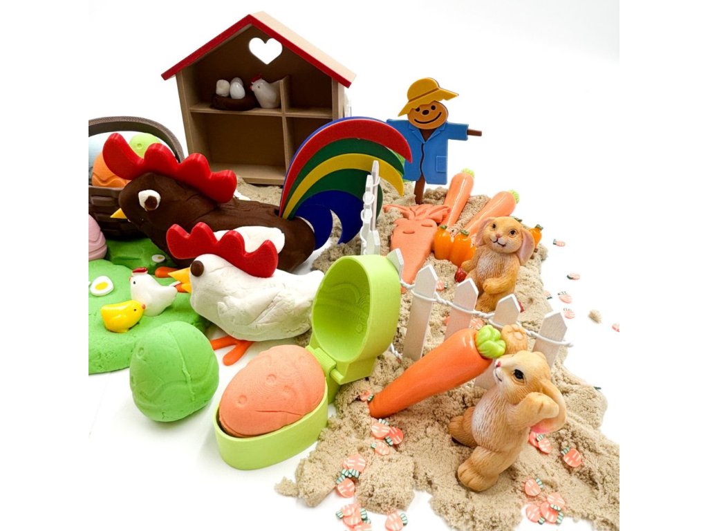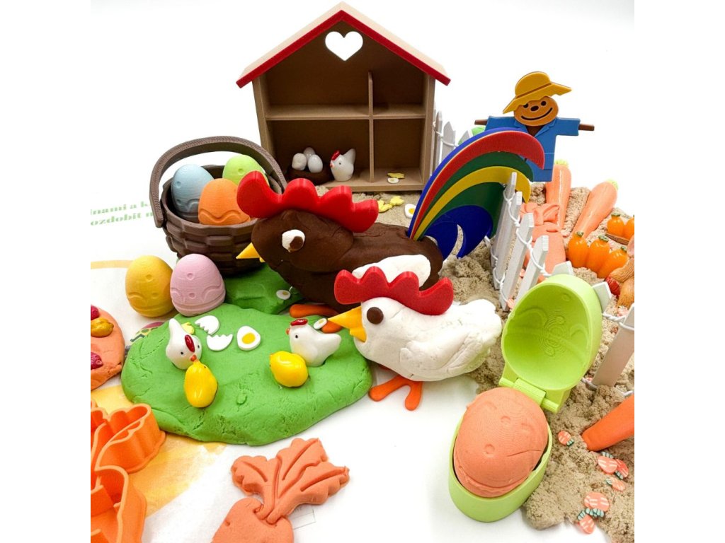 Děti mohou sázet mrkvičky do půdy z kinetického písku, klást vajíčka do košíčku nebo tvořit jarní zahrádku z modelíny.